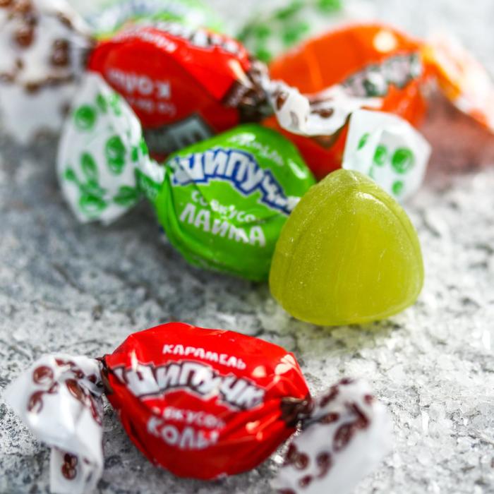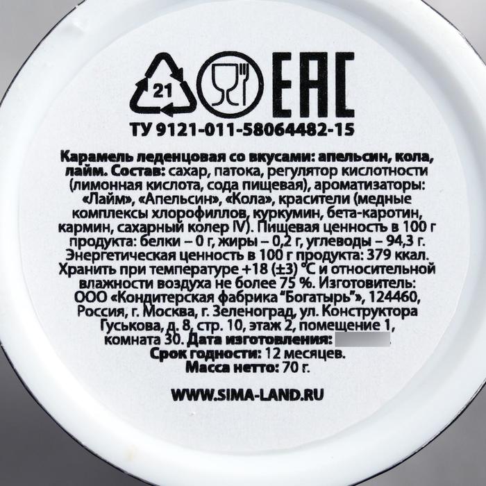 <b>Состав: сахар, патока, регулятор кислотности (лимонная кислота, сода пищевая), ароматизаторы: «Лайм», «Апельсин», «Кола», красители (медные комплексы хлорофиллов, куркумин, бета-каротин, кармин, сахарный колер IV). Масса нетто: 70 г. Срок годности: 12 месяцев.</b>