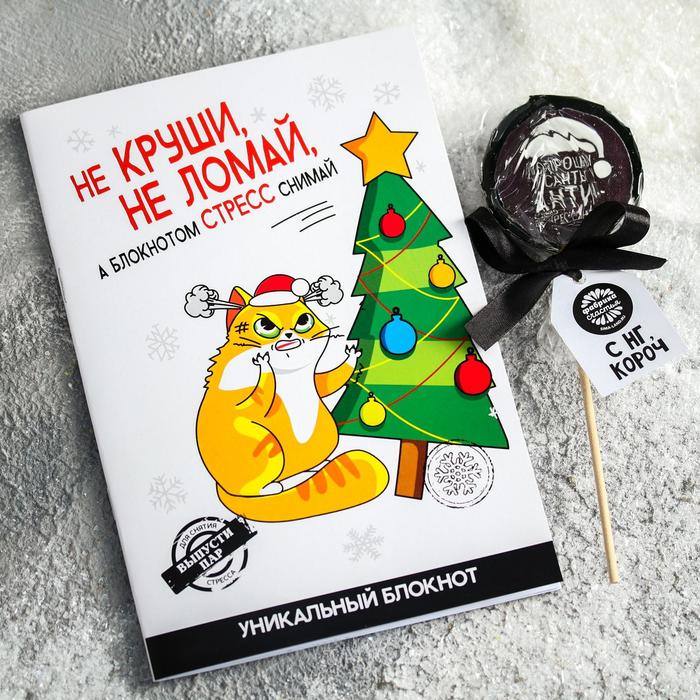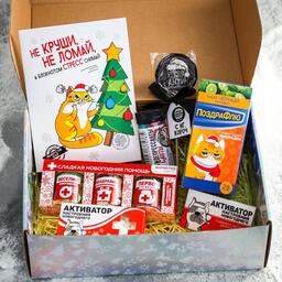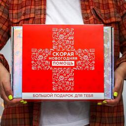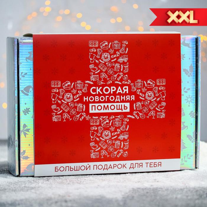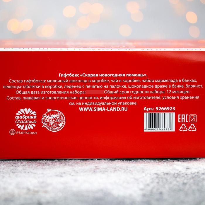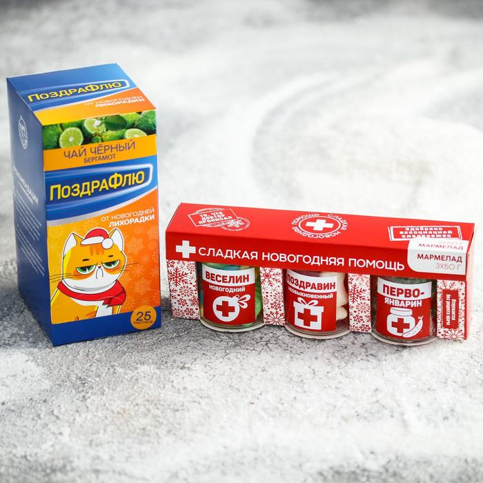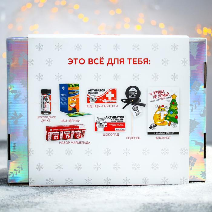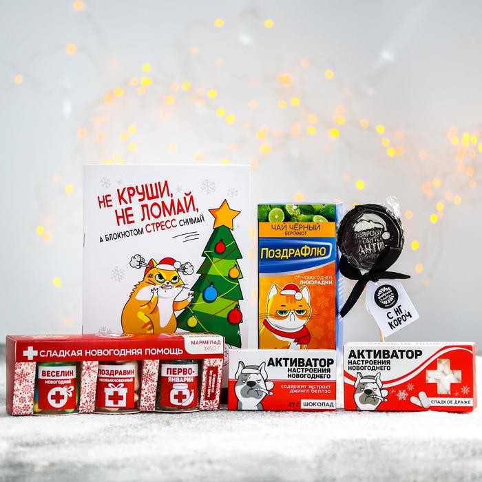 Гифтбокс подарочный «Скорая новогодняя помощь»: драже шоколадное 80 г, чай чёрный с бергамотом 25 п, конфеты-таблетки 100 г, шоколад молочный 27 г, леденец с печатью 45 г, набор мармелада 50 г х 3 шт., блокнот 5266923