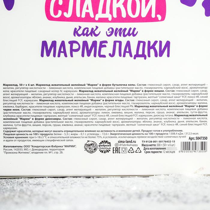 <p>Состав: Мармелад жевательный желейный «Марми» в форме бутылочки колы : глюкозный сироп, сахар, агент желирующий – желатин, регулятор кислотности – лимонная кислота (Е330), ароматизатор, красители пищевые: кармуазин (Е122), сахарный колер IV (Е150d), глазирователь: растительное масло, воск карнаубский. Мармелад жевательный желейный «Марми» в форме мишек: глюкозный сироп, сахар, агент желирующий – желатин, регулятор кислотности – лимонная кислота (Е330), ароматизаторы: «Яблоко», «Груша», «Ананас», «Клубника», «Барбарис», «Вишня», «Дыня», «Малина», «Ежевика», «Лесная ягода», «Тутти-фрутти», «Лимон», «Апельсин», «Персик», «Банан», «Черная смородина», «Земляника», «Манго», «Клюква», красители пищевые: тартразин (Е102), желтый «Солнечный закат» (Е110), понсо 4R (Е124), синий блестящий FCF (Е133), кармуазин (Е122), глазирователь – растительное масло, воск карнаубский.Мармелад жевательный желейный «Марми» в форме ягод: глюкозный сироп, сахар, агент желирующий – желатин, регулятор кислотности – лимонная кислота (Е330), ароматизаторы: «Малина», «Ежевика», «Барбарис», красители пищевые: кармуазин (Е122), понсо 4R (Е124), индигокармин (Е132), черный блестящий PN (Е151), глазирователь: растительное масло, воск карнаубский.Мармелад жевательный желейный «Марми» в форме червей неон : глюкозный сироп, сахар, агент желирующий: желатин, регулятор кислотности: лимонная кислота (Е330), ароматизаторы: «Лимон», «Ежевика», «Вишня», «Малина», «Персик», «Груша», «Ананас», «Апельсин», «Тутти-фрутти»; красители пищевые: тартразин (Е102), желтый «Солнечный закат» (Е110), понсо 4R (Е124), кармуазин (Е122), синий блестящий FCF (Е133), диоксид титана (Е171); глазирователь: растительное масло, карнаубский воск. Мармелад жевательный желейный «Марми» в форме динозавров : глюкозный сироп, сахар, агент желирующий – желатин, регулятор кислотности – лимонная кислота (Е330), ароматизаторы: «Яблоко», «Груша», «Ананас», «Клубника», «Барбарис», «Вишня», «Дыня», «Малина», «Ежевика», «Лесная ягода», «Тутти-фрутти», «Лимон», «Апельсин», «Персик», «Банан», «Черная смородина», «Земляника», «Манго», «Клюква», красители пищевые: тартразин (Е102), желтый «Солнечный закат» (Е110), понсо 4R (Е124), синий блестящий FCF (Е133), кармуазин (Е122), глазирователь – растительное масло, воск карнаубский.Масса нетто: 300 г (50 г х 6 шт.).Срок годности: 12 мес.Хранить при t +18 (±3) °С и относительной влажности не более 75 % в условиях, исключающих прямое воздействие солнечных лучей, и вдали от продуктов, имеющих специфический запах.</p>