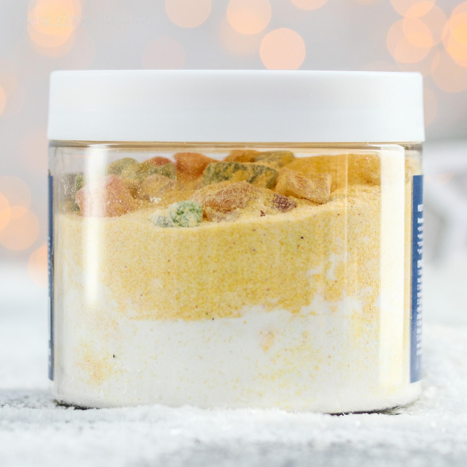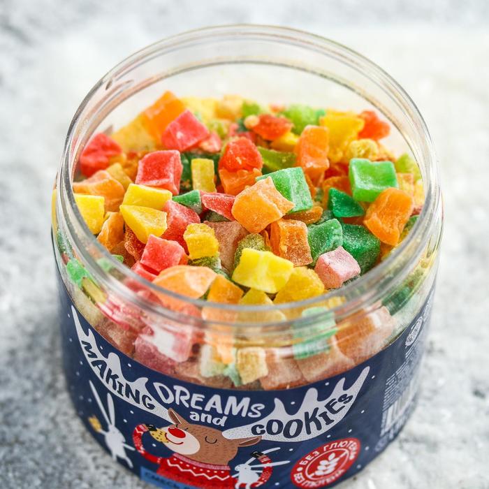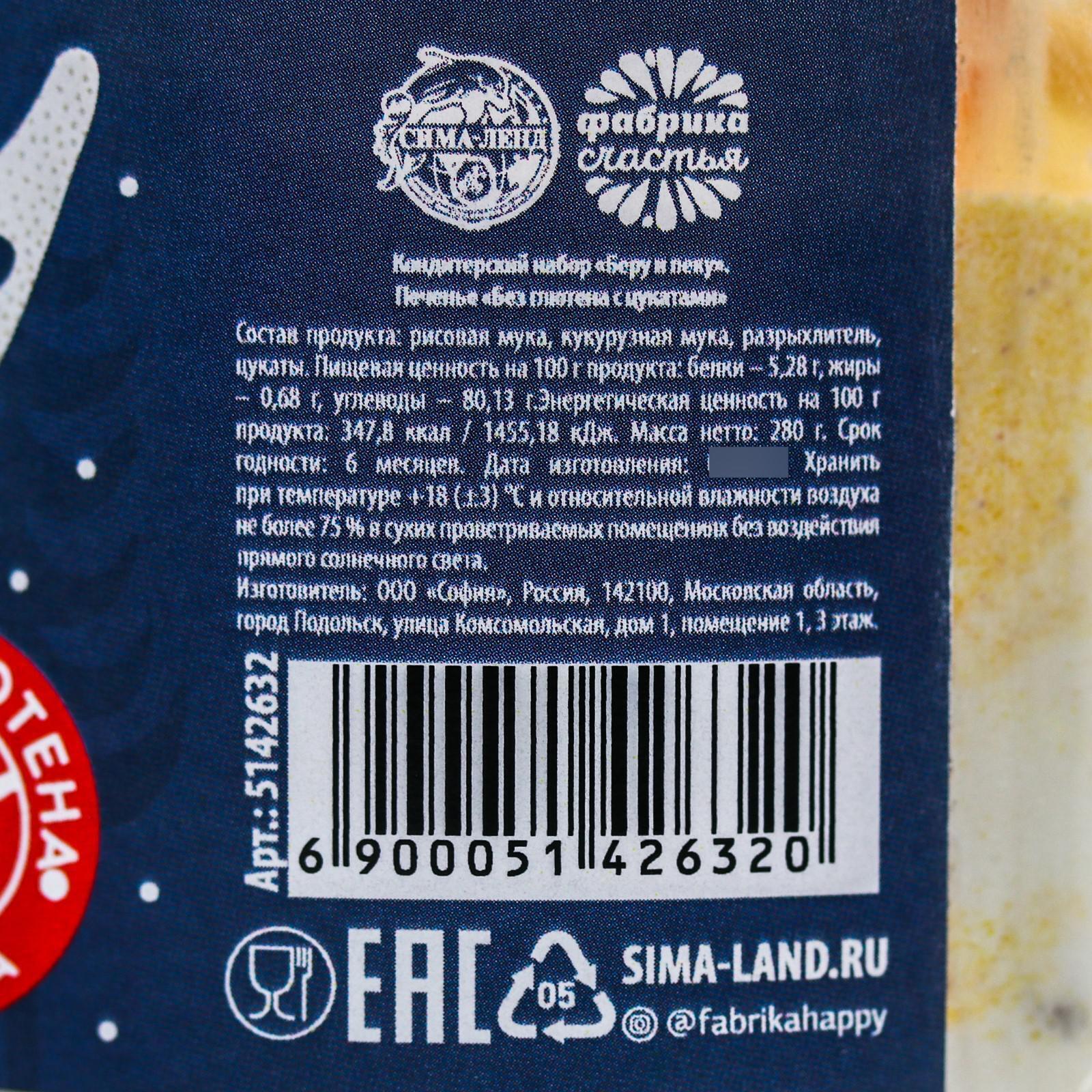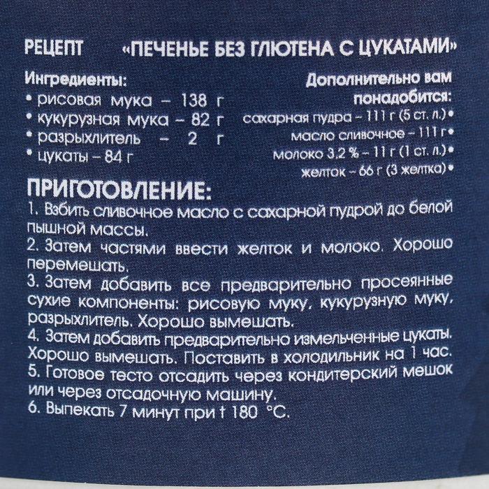 Состав продукта: рисовая мука, кукурузная мука, разрыхлитель, цукаты.