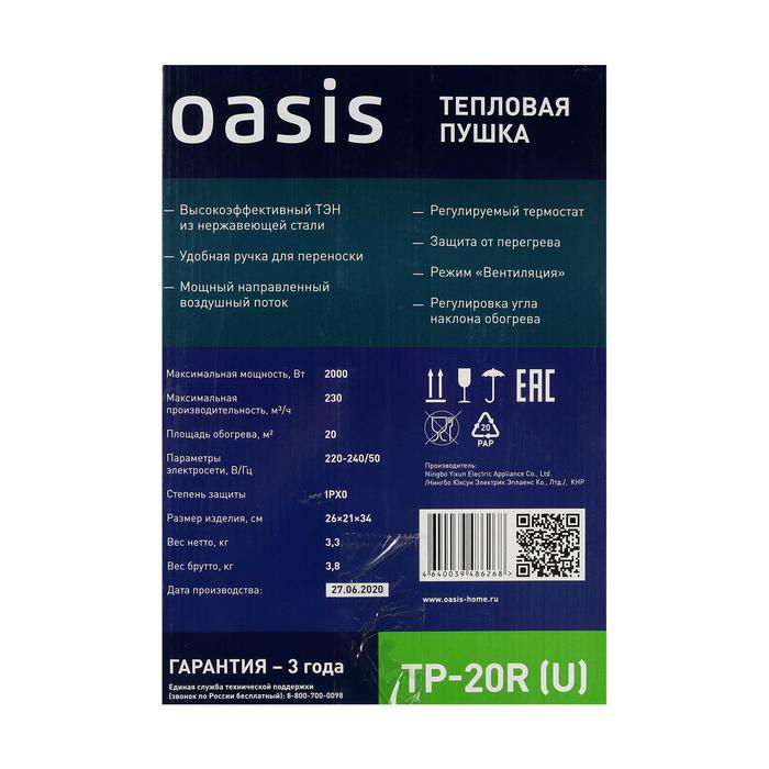 Тепловая пушка Oasis TP-20R, электрическая, 220 В, 25/2000 Вт, 230 м3/ч, до 20 м2, IPX0 5312188