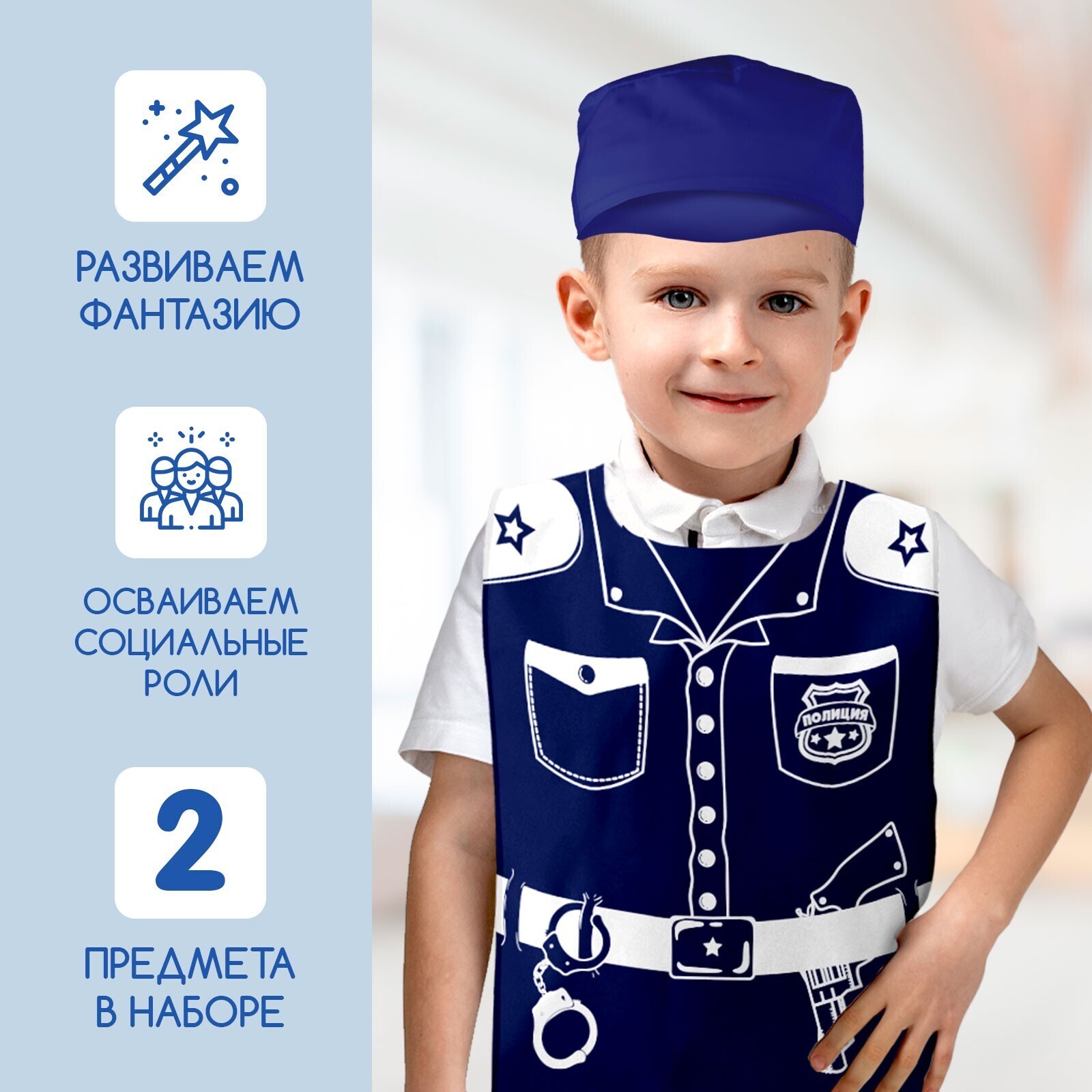 Игровой набор познакомит малыша с профессией полицейского и поможет освоить новые социальные роли. Ребёнок с удовольствием наденет жилет и фуражку и будет следить за порядком — совсем как настоящий страж закона.