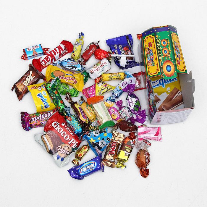 В комплектации подарка 35 изделий: Mars: Nestle: КДВ, Яшкино: Slasti: Sweet life: Красный Октябрь: Рот Фронт: Славянка: Акконд: Победа: