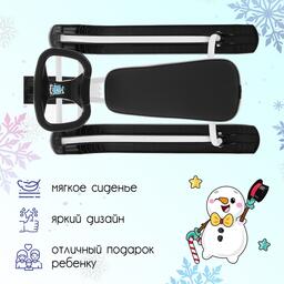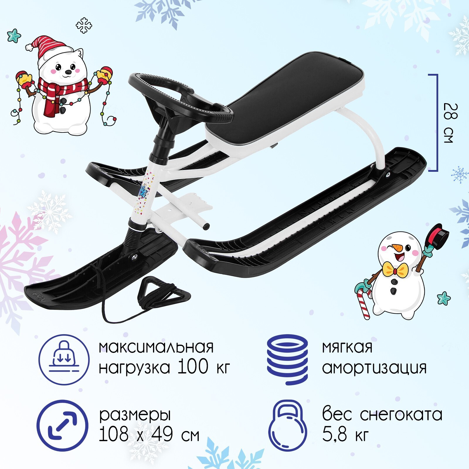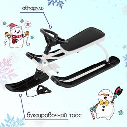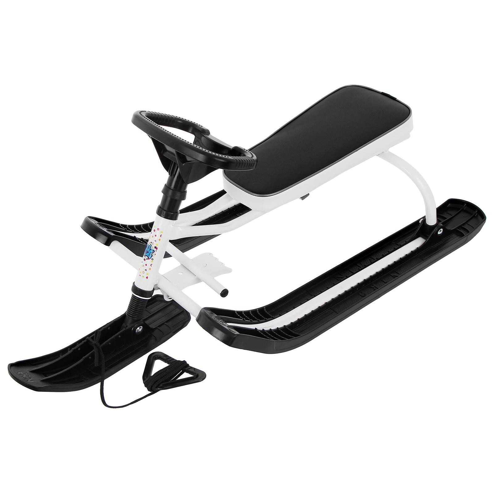 Снегокат предназначен для перевозки детей по плотному снегу или льду, катанию с горок. Имеет сварную конструкцию из стальных труб, пластиковых элементов и мягкое сиденье, обтянутое искусственной кожей. Оснащён буксировочным тросом. Тормоз эффективен на обледенелой поверхности.