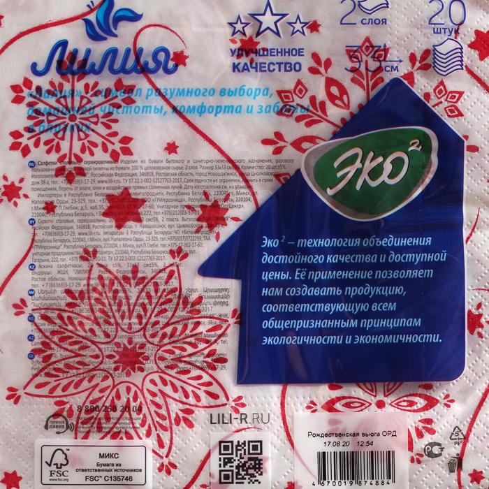 Салфетки бумажные Лилия 33х33 "Рождественская вьюга" ОРД 2сл 20л, Рождественская вьюга (кра 5378269