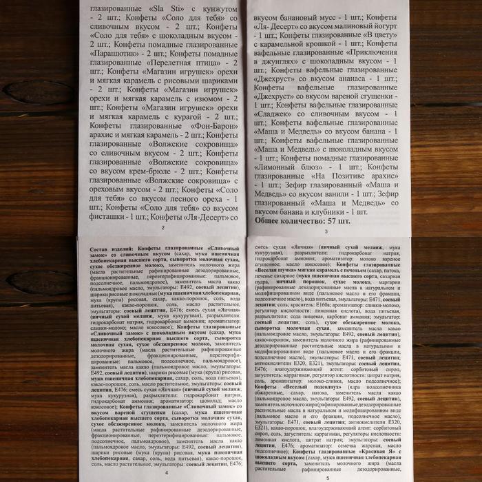 <h4>В набор входит 57 конфет КФ «Сласти»:</h4><ul><li>конфета «Сливочный замок» с шоколадным вкусом - 2 шт.</li><li>конфета «Сливочный замок» со вкусом варёной сгущёнки - 2 шт.;</li><li>конфета «Сливочный замок» со сливочным вкусом - 2 шт.</li><li>конфета «Весёлая щучка» (мягкая карамель с печеньем) - 2 шт.</li><li>конфета «Весёлый подсолнух» - 2 шт.</li><li>конфета глазированная «Красивая Я» со вкусом врёной сгущенки - 2 шт.</li><li>конфета Sla Sti с кунжутом - 2 шт.</li><li>конфета Sla Sti с кунжутом и изюмом - 2 шт.</li><li>конфета «Соло для тебя» со сливочным вкусом - 2 шт.</li><li>конфета «Соло для тебя» с шоколадным вкусом - 2 шт.</li><li>конфета «Соло для тебя» со вкусом лесного ореха - 1 шт.</li><li>конфета «Соло для тебя» со вкусом фисташки - 1 шт.</li><li>конфета «Ля- Десерт» со вкусом банановый мусс - 1 шт.</li><li>конфета «Ля- Десерт» со вкусом малиновый йогурт - 1 шт.</li><li>конфета глазированная «Красивая Я» со сливочным вкусом - 2 шт.</li><li>конфета глазированная «Красивая Я» с шоколадным вкусом - 2 шт.</li><li>конфета вафельная глазированная «Сладжек» со сливочным вкусом - 1 шт.</li><li>конфета «В цвету» с карамельной крошкой - 1 шт.</li><li>конфета глазированная «На Позитиве арахис» - 1 шт.</li><li>конфета помадная глазированная «Лимонный блюз» - 1 шт.</li><li>конфета вафельная глазированная «Приключения в джунглях» с шоколадным вкусом - 1 шт.</li><li>конфета вафельная глазированная «Джехруст» со вкусом ананаса - 1 шт.</li><li>конфета вафельная глазированная «Джехруст» со вкусом вареной сгущенки - 1 шт.</li><li>конфета помадная глазированная «Парашютик» - 2 шт.</li><li>конфета помадная глазированная «Перелетная птица» - 2 шт.</li><li>конфета вафельная глазированная «Маша и Медведь» со вкусом банана - 1 шт.</li><li>конфета вафельная глазированная «Маша и Медведь» с шоколадным вкусом - 1 шт.</li><li>конфета «Магазин игрушек» (орехи, мягкая карамель и рисовые шарики) - 2 шт.</li><li>конфета «Магазин игрушек» (орехи, мягкая карамель с изюмом) - 2 шт.</li><li>конфета «Магазин игрушек» (орехи, мягкая карамель с курагой) - 2 шт.</li><li>конфета глазированная «Фон-барон» (арахис и мягкая карамель) - 2 шт.</li><li>конфета глазированная «Волжские сокровища» с ореховым вкусом - 2 шт.</li><li>конфета глазированная «Волжские сокровища» со сливочным вкусом - 2 шт.</li><li>конфета глазированная «Волжские сокровища» со вкусом крем-брюле - 2 шт.</li><li>зефир глазированный «Маша и Медведь» со вкусом банана и клубники - 1 шт.</li><li>зефир глазированный «Маша и Медведь» со вкусом ванили - 1 шт.</li></ul><p>Изготовитель оставляет за собой право частичной замены товара на аналогичный.</p>