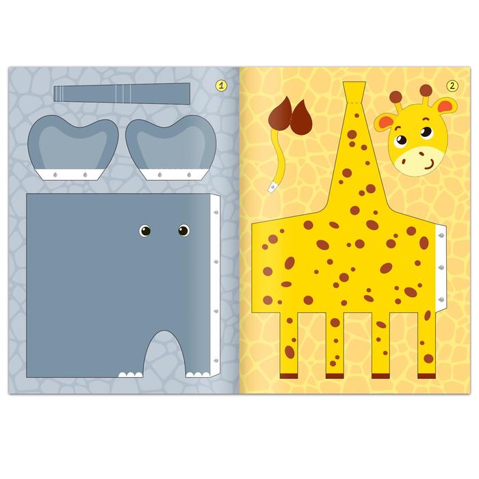 Внутри книги вы найдёте 8 заготовок для создания фигурок животных. Нужно просто вырезать детали и склеить между собой.
