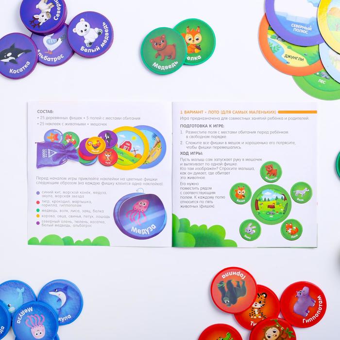 Где обитает гиппопотам? Где живут шимпанзе? Благодаря этому лото дети познакомятся с местами обитания разных животных, а ещё натренируют внимание, память и логику.