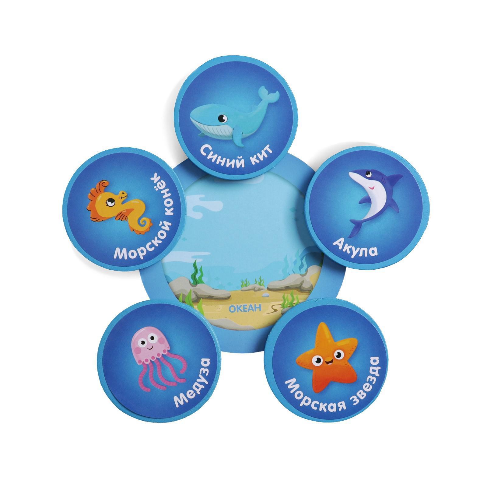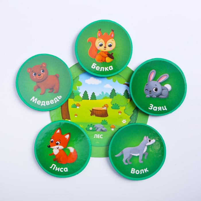 В наборе вы найдёте 5 круглых игровых полей, каждое из которых обозначает место обитания: лес, ферму, джунгли, океан, Северный полюс. А ещё 25 деревянных фишек, на которые нужно приклеить наклейки с животными.