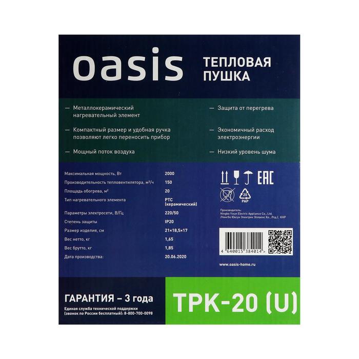 Тепловая пушка Oasis TPK-20, электрическая, 220 В, 1000/2000 Вт, 150 м3/ч, до 20 м2, IP20 5312184