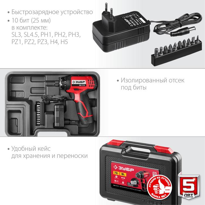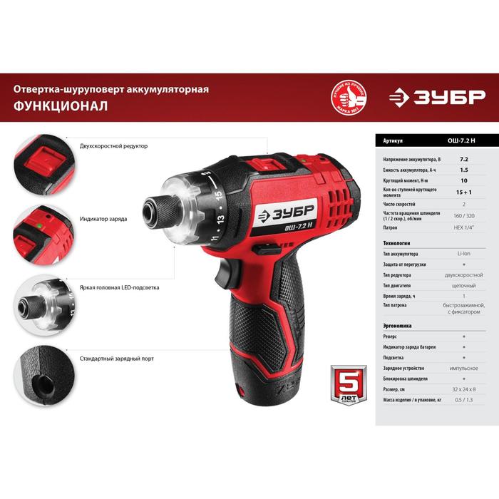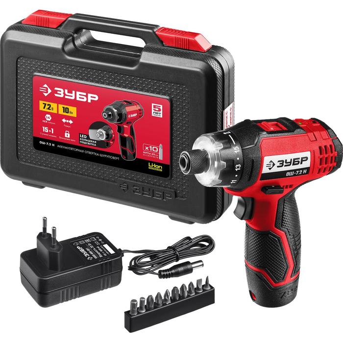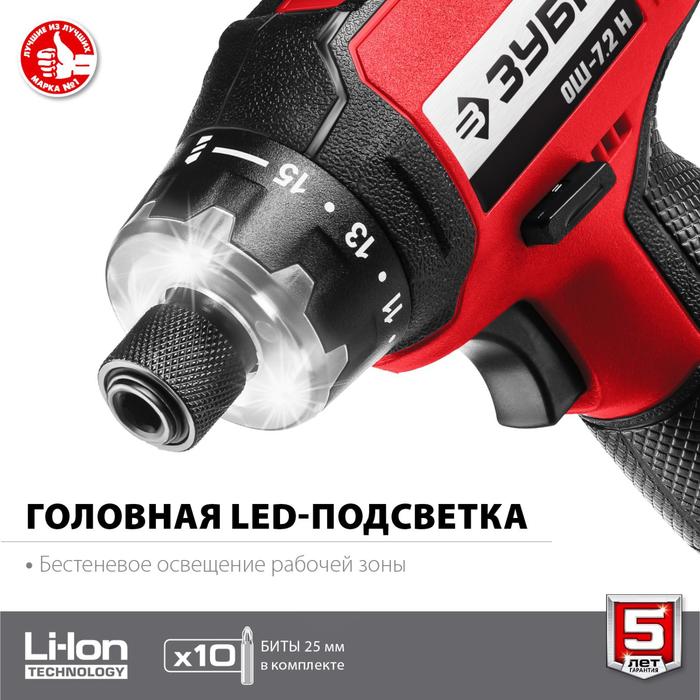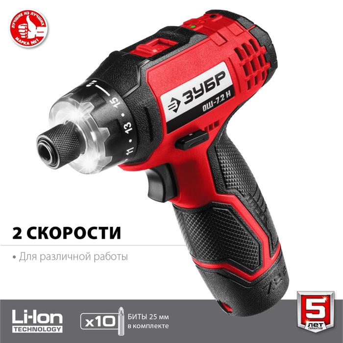 Отвертка аккумуляторная "ЗУБР" ОШ-7.2 Н, 7.2 В, 2 скорости, частота вращения 160/320 об/мин 538504 5385049