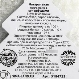 <p>Состав:сахар,сироп глюкозы,пищевый крсители и ароматизаторы "Земляника",лимонная кислота. Масса нетто: 30 г. Хранить при температуре от +5 °С до +22 °С и относительной влажности не выше 75 %. Срок годности: 12 месяцев.</p>