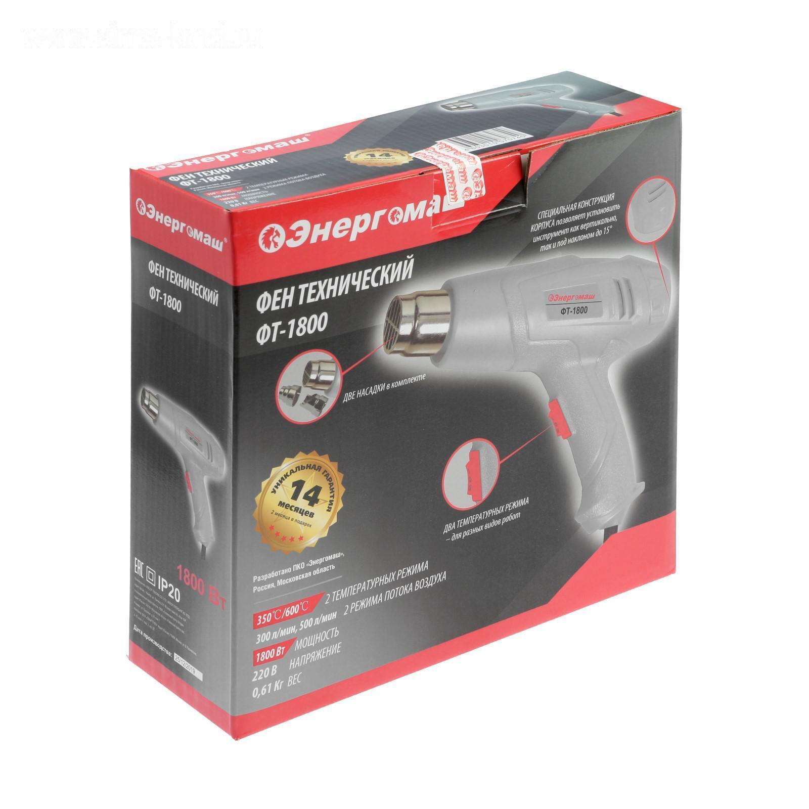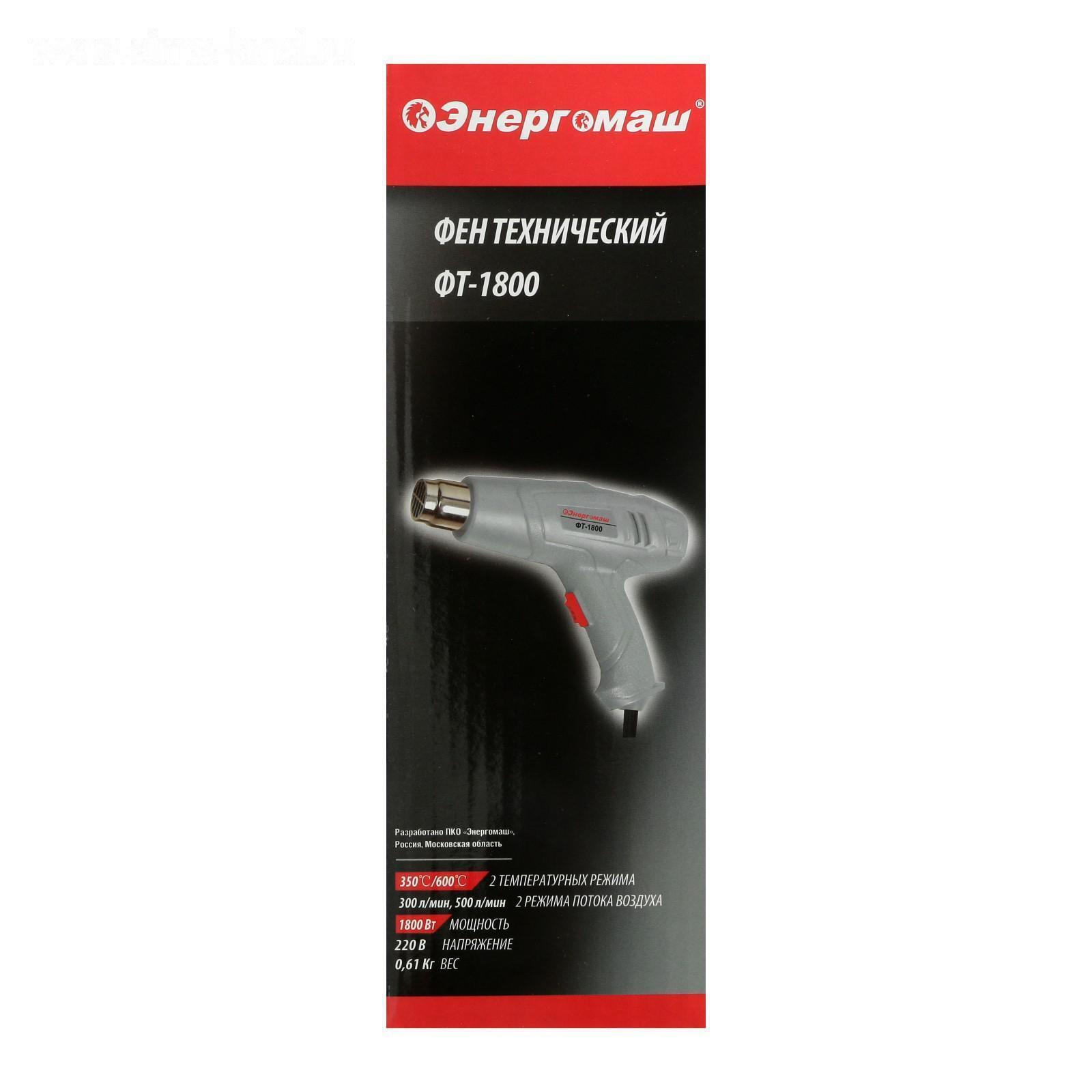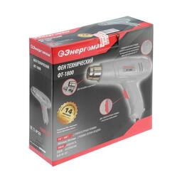 Фен технический "Энергомаш" ФТ-1800, 220 В, 1800 Вт, 2 ступени, 350/600 °С, 2 насадки 5308776