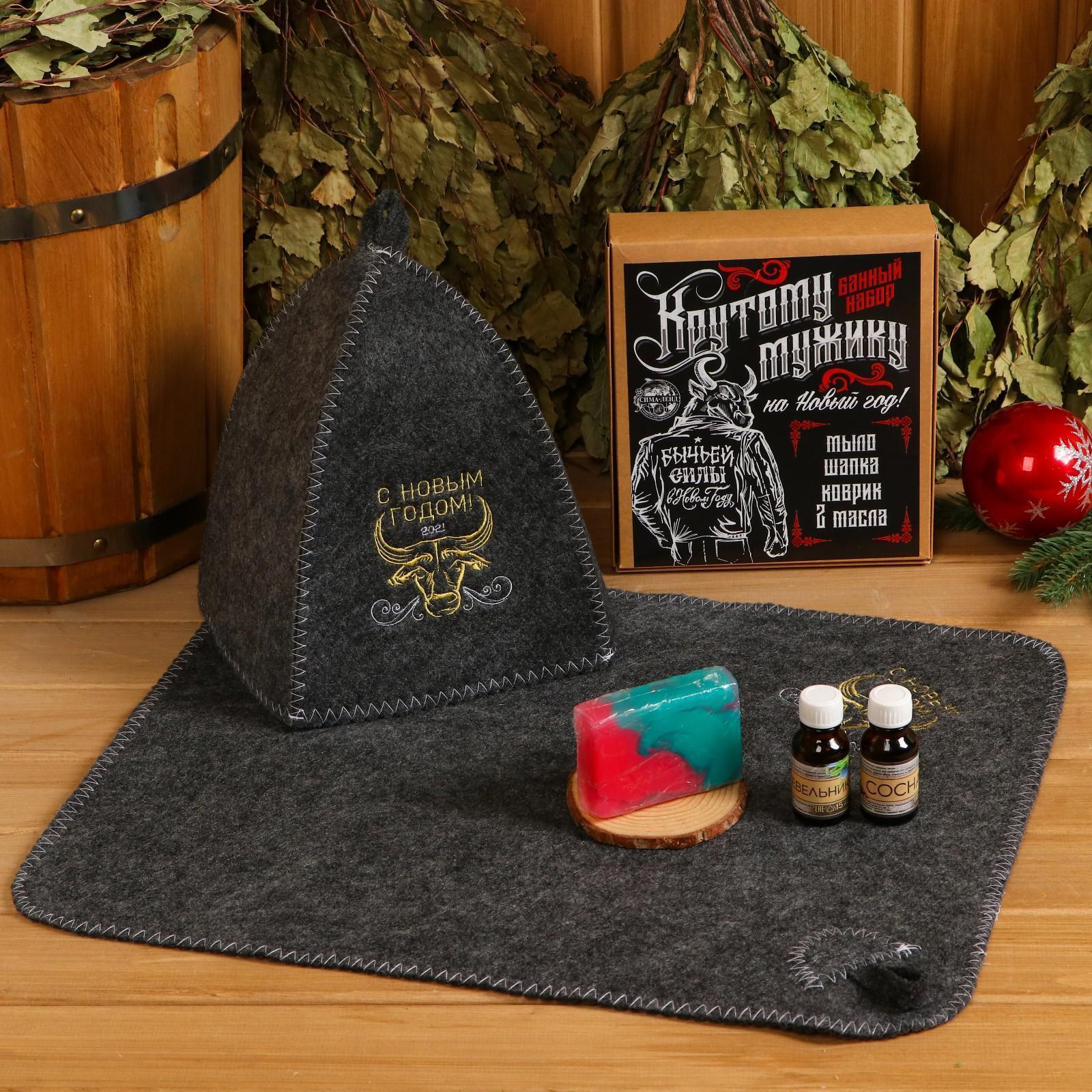 Банный набор "Крутому мужику" шапка, коврик, 2 масла, мыло символ года 5260196