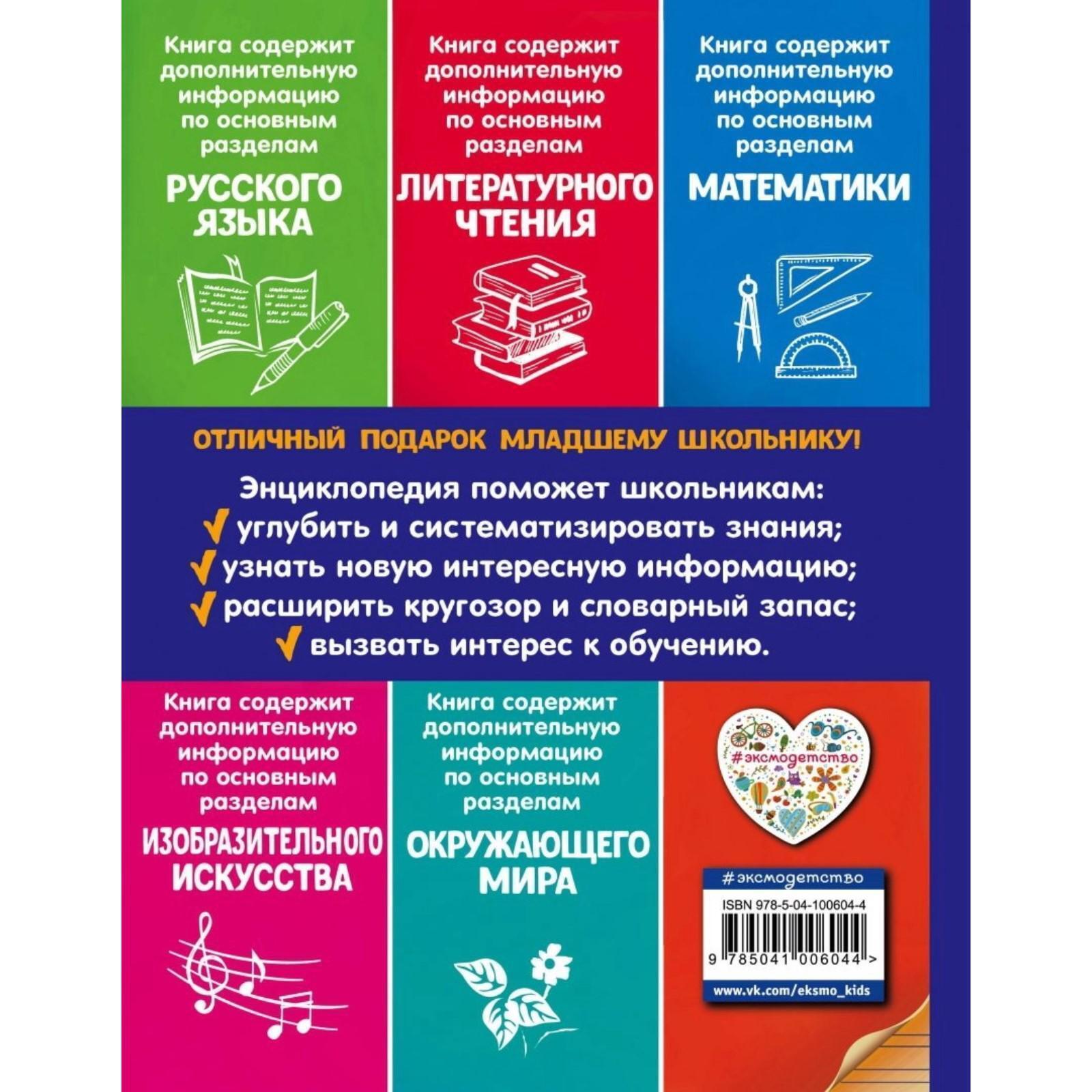 Юные читатели найдут в книге ответы на сотни вопросов, остающихся за рамками школьной программы, а также узнают много нового о русском языке, литературе, математике, окружающем мире, искусстве, истории. Энциклопедия включает в себя интересные факты, занимательные истории и другую дополнительную информацию по основным темам начальной школы. Красочные познавательные иллюстрации помогут лучше запомнить и усвоить материал. А с помощью визуальных словарей, входящих в книгу, дети обогатят свой словарный запас, расширят кругозор, легко и быстро запомнят словарные слова, исторические даты, имена писателей художников и композиторов. Книга, адресованная любознательным школьникам, поможет узнать много нового, дополнить свой ответ на уроке интересными фактами или подготовить доклад.