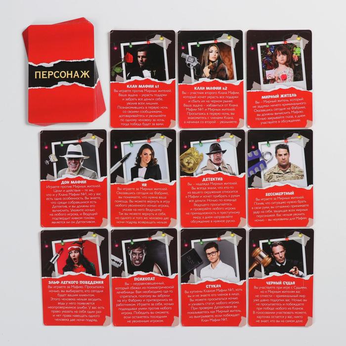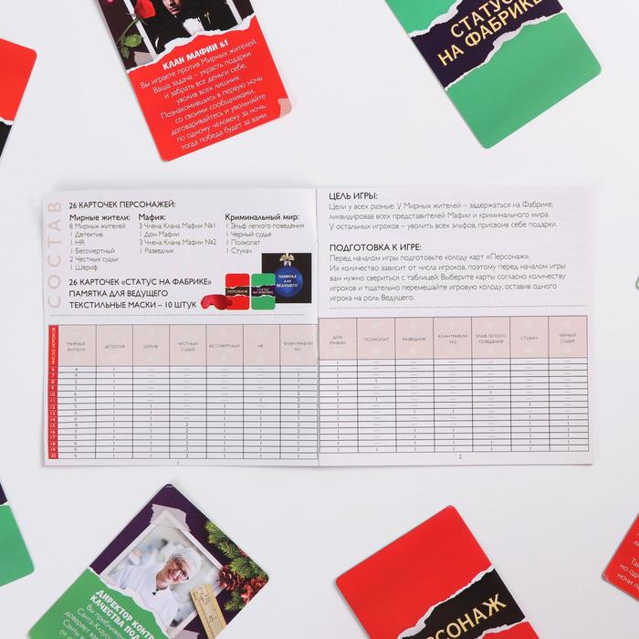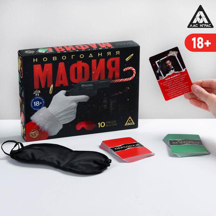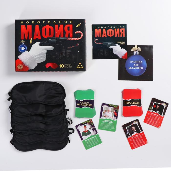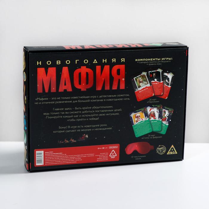 <p><b>Остросюжетная детективная игра</b></p><p>«Мафия» — это не только известнейшая игра с детективным сюжетом. Это ещё и отличное развлечение для большой компании в новогоднюю ночь. Главное здесь — быть крайне убедительным, ведь только так вы сможете добиться поставленных целей. Планируйте каждый шаг и используйте свою интуицию, чтобы прийти к победе!</p><p>Бонус! В игре есть новогодние роли, которые сделают её веселее и неожиданнее.</p><p><b>Как играть?</b></p><p>У каждого игрока будет цель. У мирных жителей — задержаться на Фабрике, ликвидировав всех представителей мафии и криминального мира. Остальные игроки должны уволить всех простых эльфов, присвоив себе подарки.</p><p>Ведущий раздаёт всем участникам по одной карте из колод «Персонаж» и «Статус на Фабрике». Все игроки знакомятся со своими ролями, карты персонажей никому показывать нельзя, а вот о вашем статусе на Фабрике вы можете смело заявить. Каждый участник берёт себе маску, в наборе вы найдёте 10 штук.</p><p>Ведущий знакомится со сценарием, зачитывает его и объявляет о начале ночи: все участники игры засыпают — закрывают глаза и надевают маски. А дальше всё как обычно. Кто окажется победителем, а кто потерпит поражение? Это вам и предстоит узнать!</p><p><b>Внутри вы найдёте</b></p><ul><li>26 карточек персонажей.</li><li>26 карточек «Статус на Фабрике».</li><li>10 текстильных масок.</li><li>Памятка для ведущего.</li><li>Правила игры.</li></ul><p><b>Играйте и встречайте Новый год вместе с ЛАС ИГРАС!</b></p>