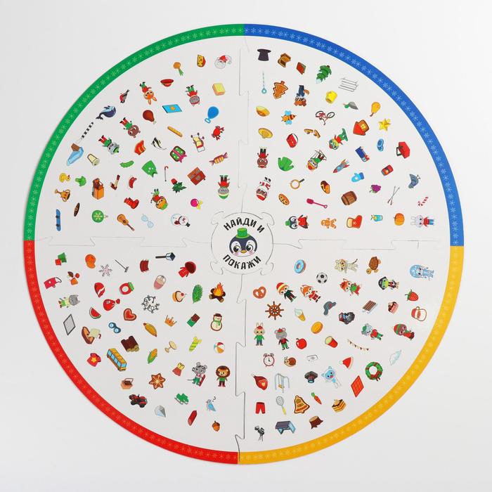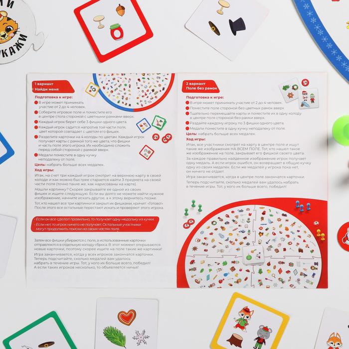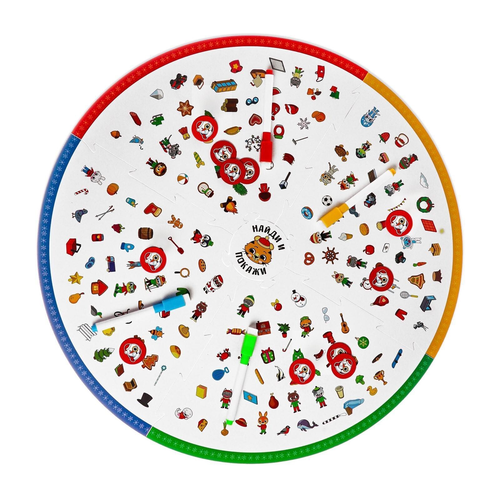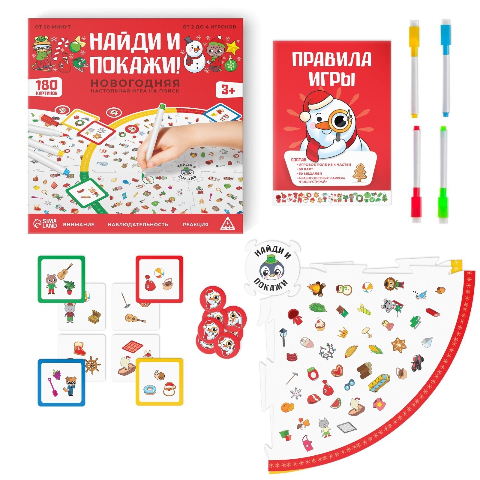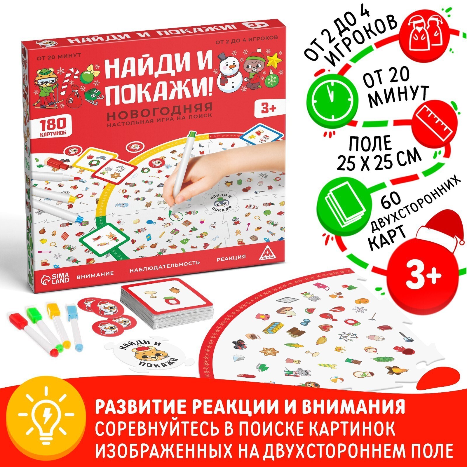 С игрой «Найди и покажи» вы проведёте новогодние каникулы весело и познавательно! Она поможет развить наблюдательность, ловкость и быструю реакцию. Внутри набора ждут: двустороннее игровые поля с разнообразными картинками, карточки и яркие маркеры. Присоединяйтесь к соревнованию и становитесь настоящим чемпионом по поиску предметов. Ведь только так можно победить!