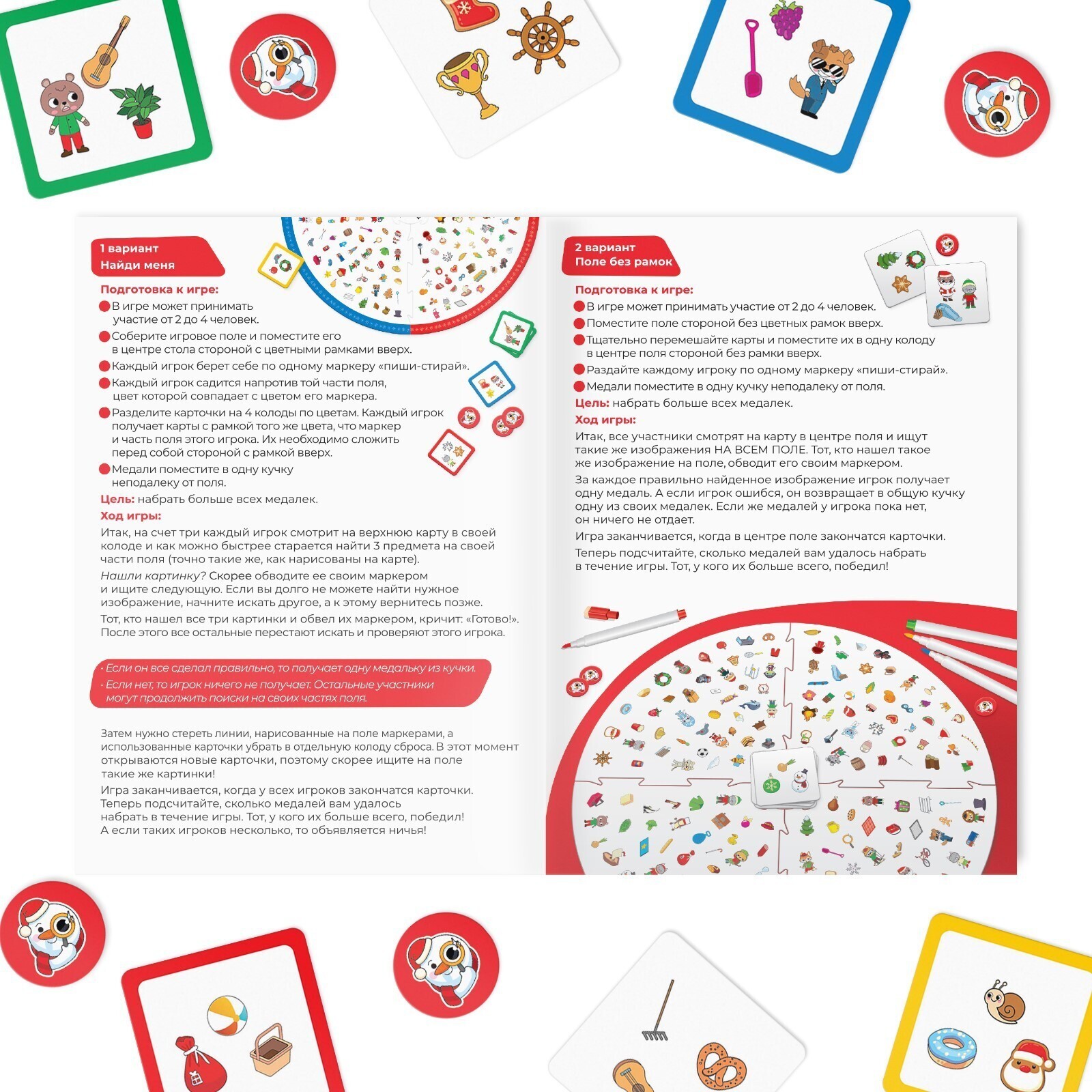 Соревнуйтесь в поиске картинок, которые нарисованы на двустороннем поле. На помощь придёт специальный маркер. Кричите: «готово!», как только найдёте и обведёте все 3 картинки. Получайте за это медальки и становитесь победителем!