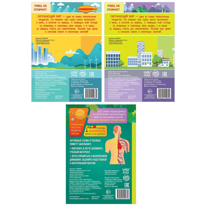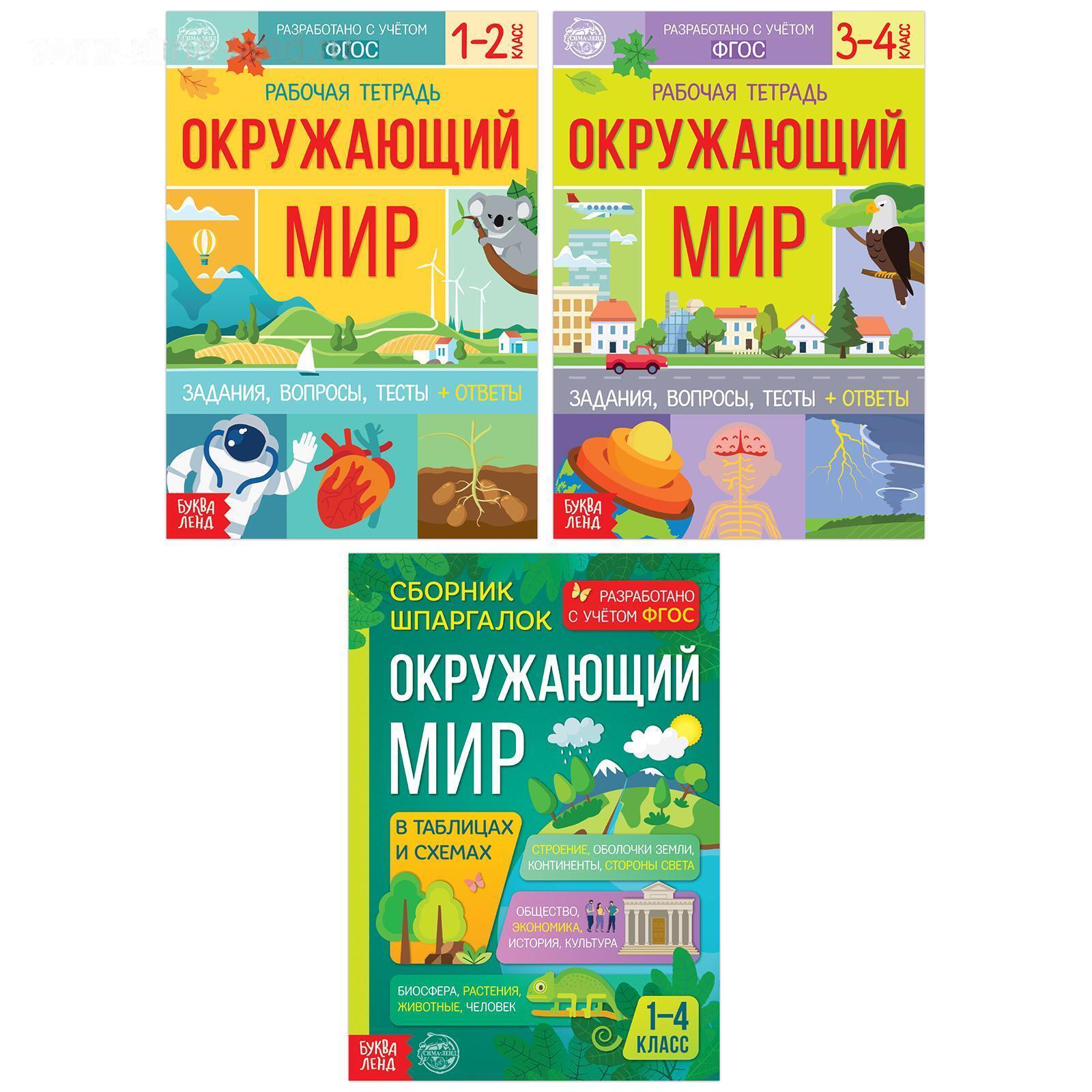 В набор входит сборник шпаргалок по темам программы по окружающему миру в начальной школе, а также 2 рабочие тетради (отдельно для 1–2 и 3–4 классов) для проверки знаний и подготовки к проверочным и контрольным работам.