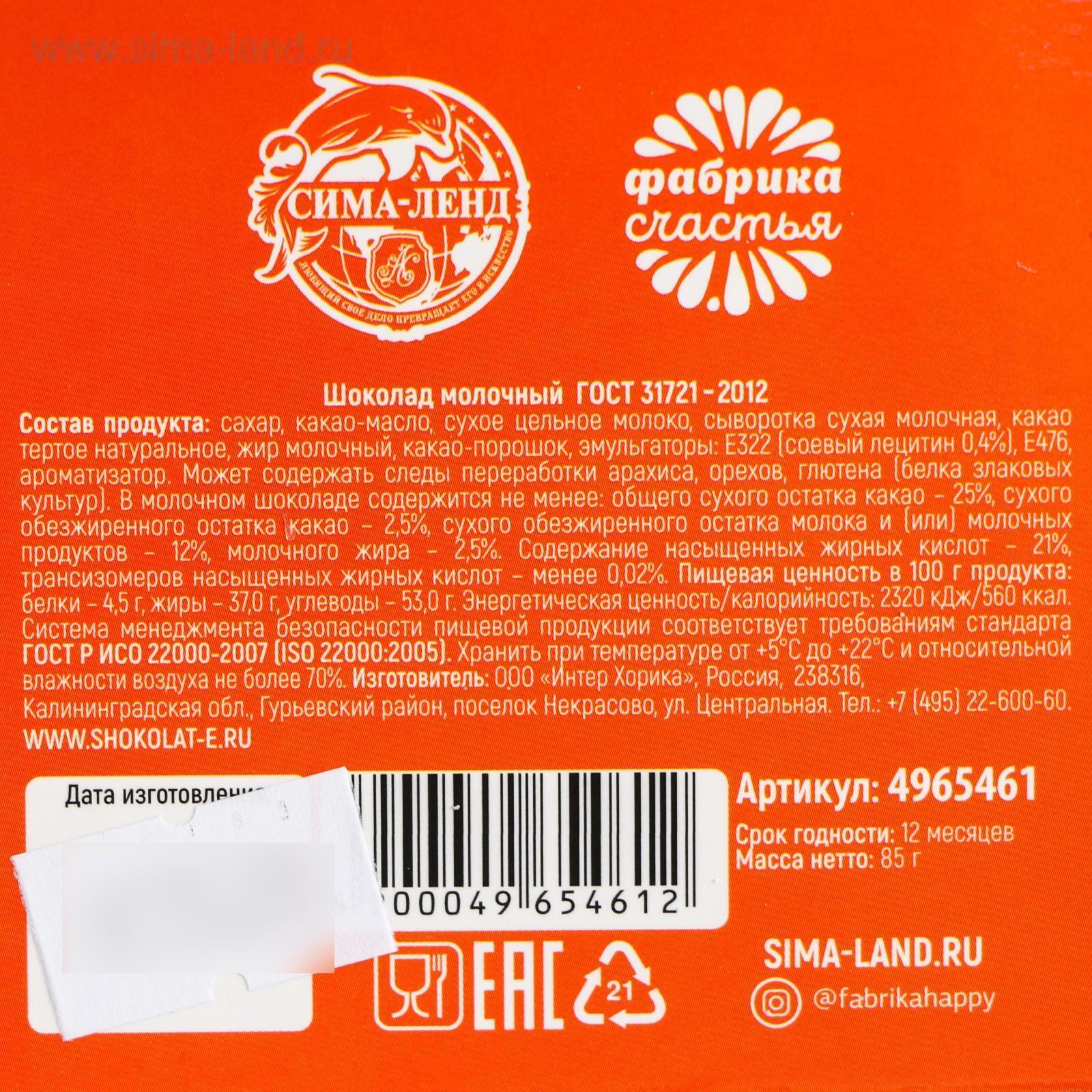 Состав: сахар, какао-масло, сухое цельное молоко, сыворотка сухая молочная, какао тертое натуральное, жир молочный, какао-порошок, эмульгаторы: Е322 (соевый лецитин 0,4 %), Е476, ароматизатор. Может содержать следы переработки арахиса, орехов, глютена (белка злаковых культур). В молочном шоколаде содержится не менее: общего сухого остатка какао – 25 %, сухого обезжиренного остатка молока и (или) молочных продуктов – 12 %, молочного жира – 2,5 %. Содержание насыщенных жирных кислот – 21 %, трансизомеров ненасыщенных жирных кислот – менее 0,02 %.