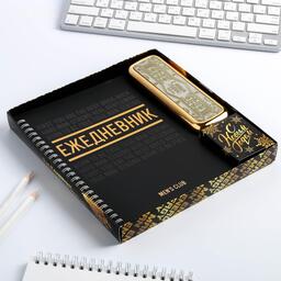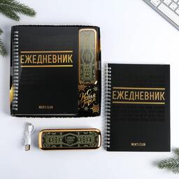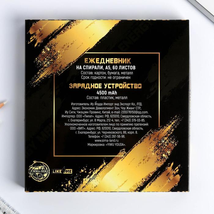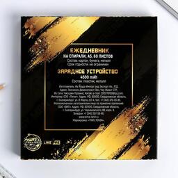 В набор входит ежедневник на спирали формата А5 (60 листов) и зарядное устройство 4500 mAh (размер 14,5 х 2,5 х 5 см).