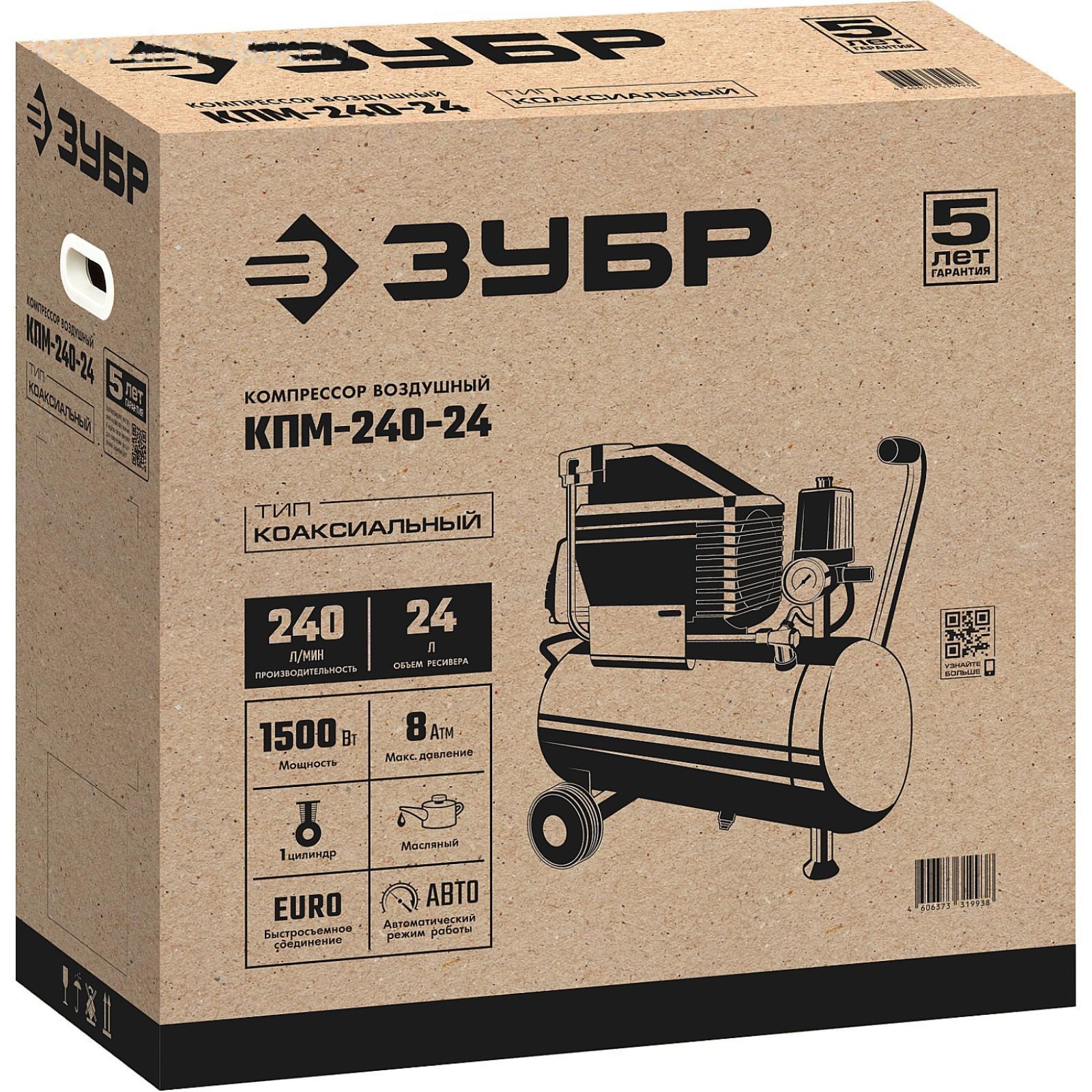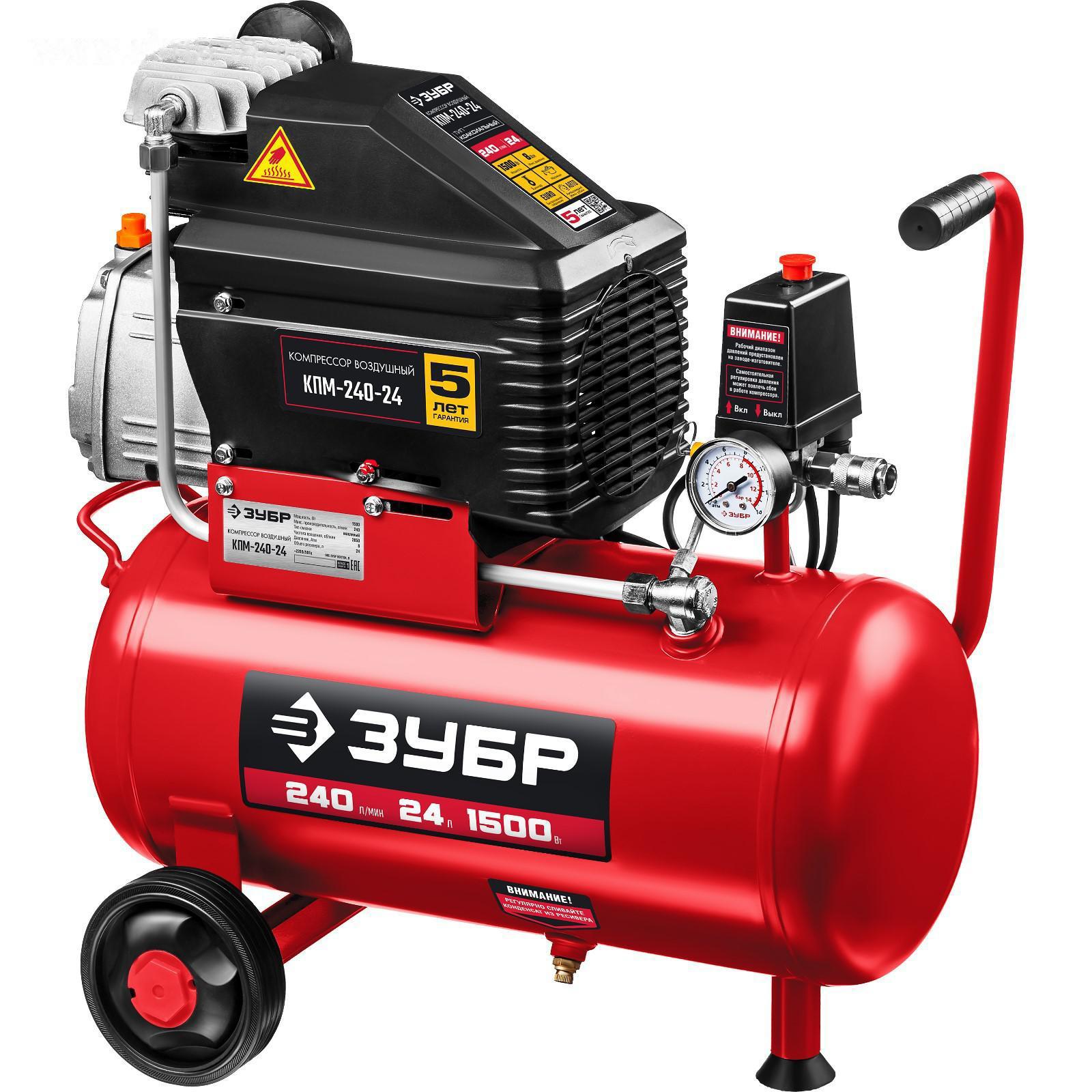 Компрессор "ЗУБР" КПМ-240-24, воздушный, масляный, 1500 Вт, 2850 об/мин, 24 л, 240 л/мин 5385061