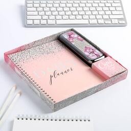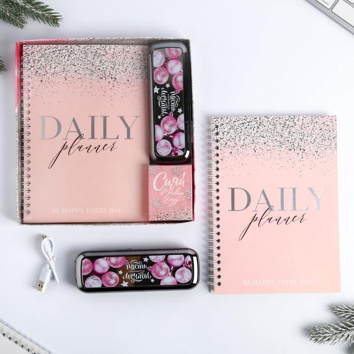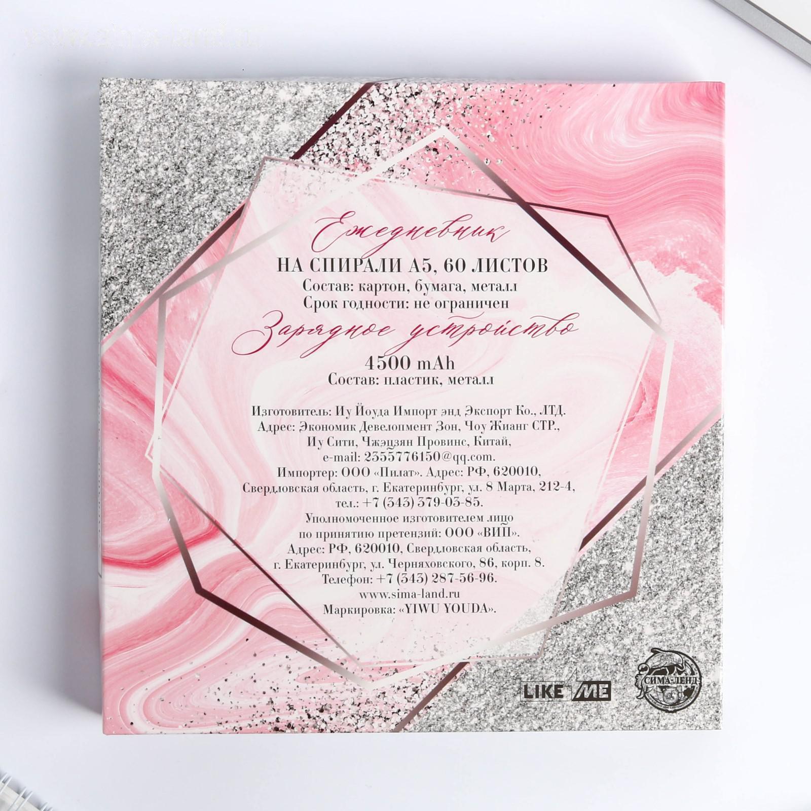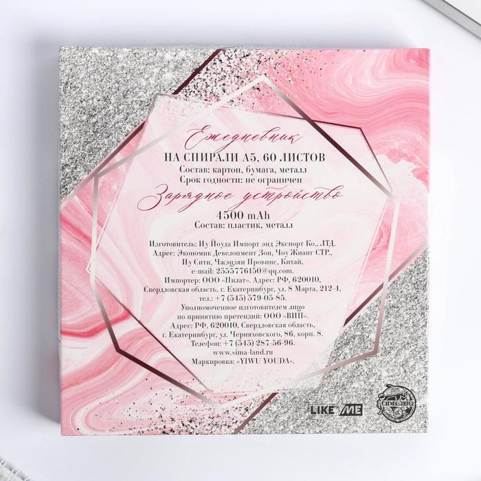 В набор входит ежедневник на спирали формата А5 (60 листов) и зарядное устройство 4500 mAh (размер 14,5 х 2,5 х 5 см).
