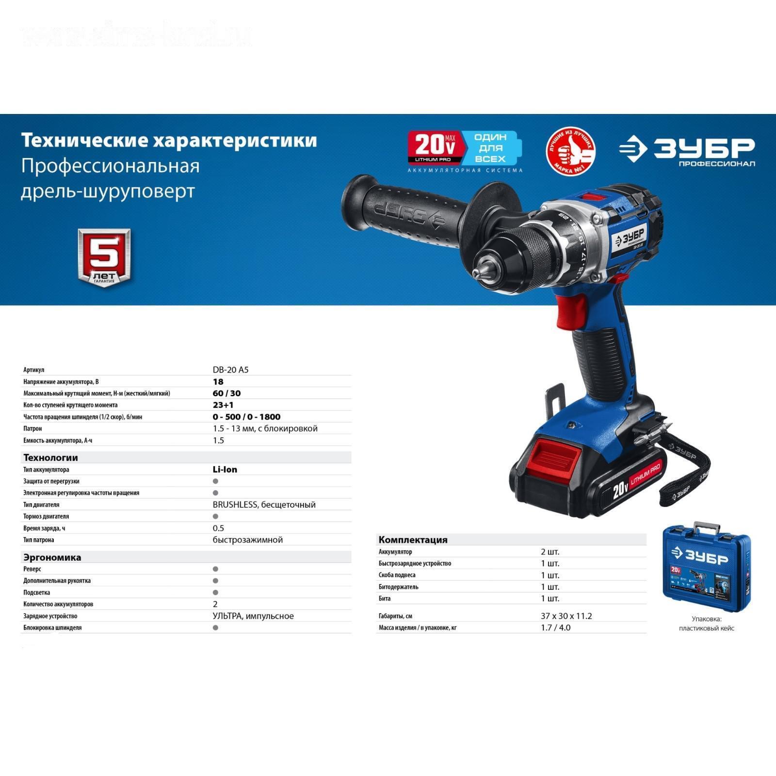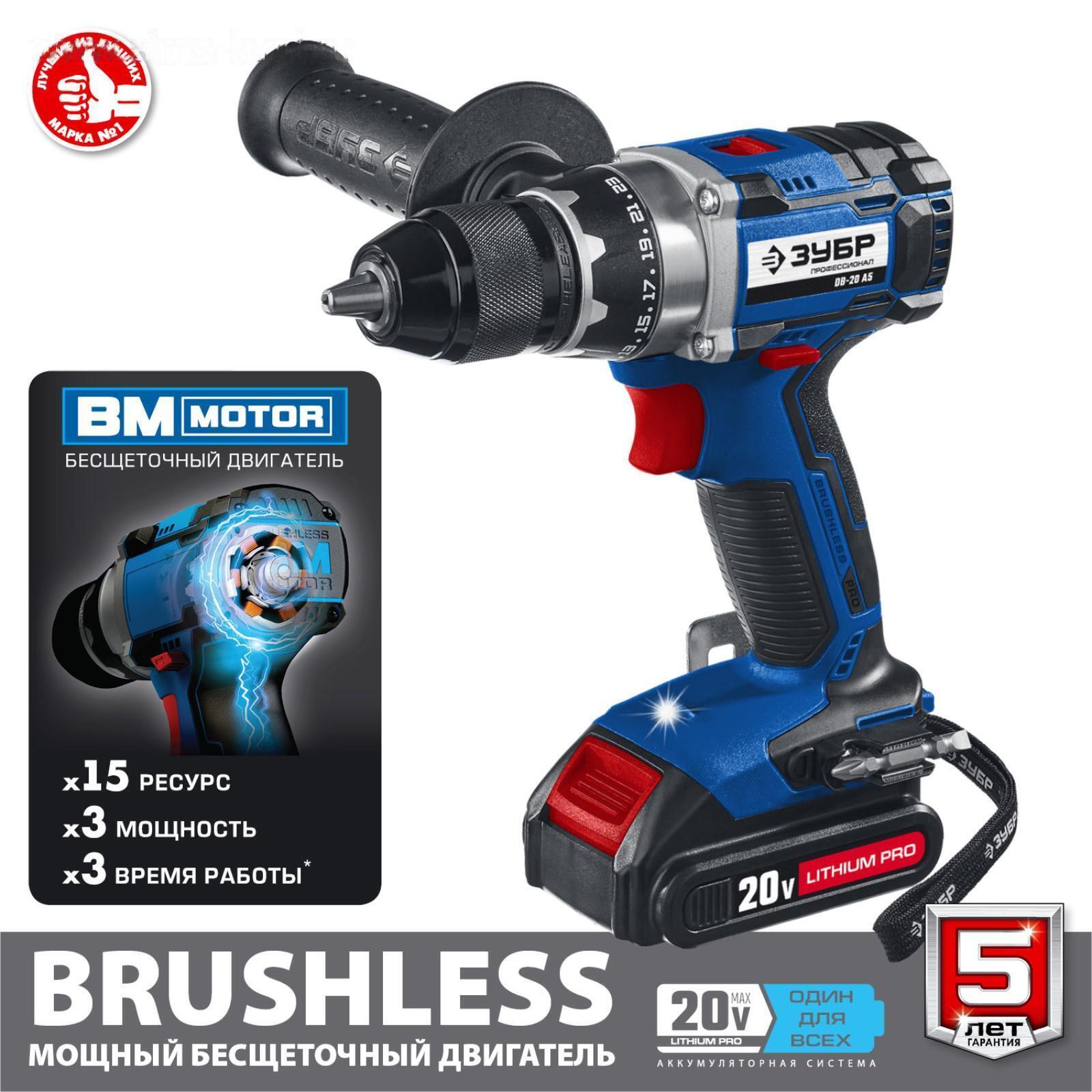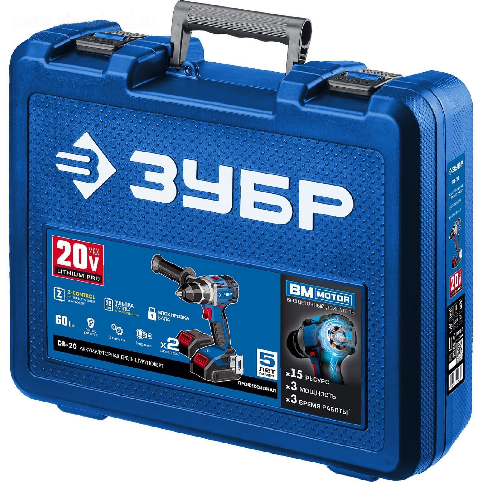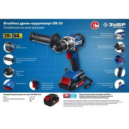 Дрель-шуруповерт "ЗУБР" DB-20 A5, бесщеточный, 20В, 2х1.5 Ач, Li-Ion, 60 Нм, 500/1800 об/мин 53850 5385072