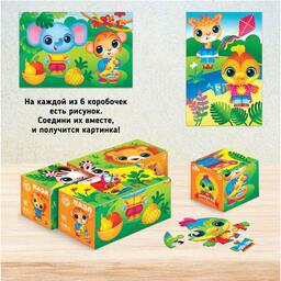 Но и это еще не всё! Покупая шоубокс, вы приобретаете не только 6 коробочек с разными пазлами, но и кубики! Да, вам не показалось! На 3 гранях коробочек напечатана часть рисунка, т.е. коробочками можно играть как кубиками, складывая картинку.