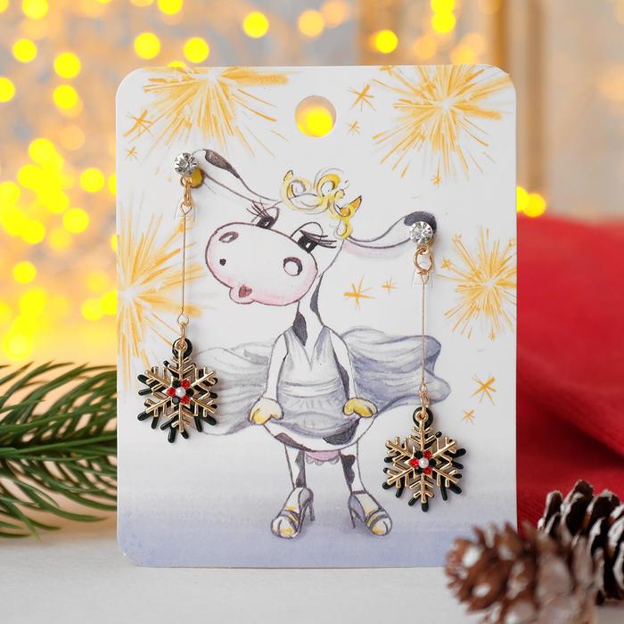 Серьги "Новогодние" две снежинки, цвет красно-зелёный в золоте 4964963
