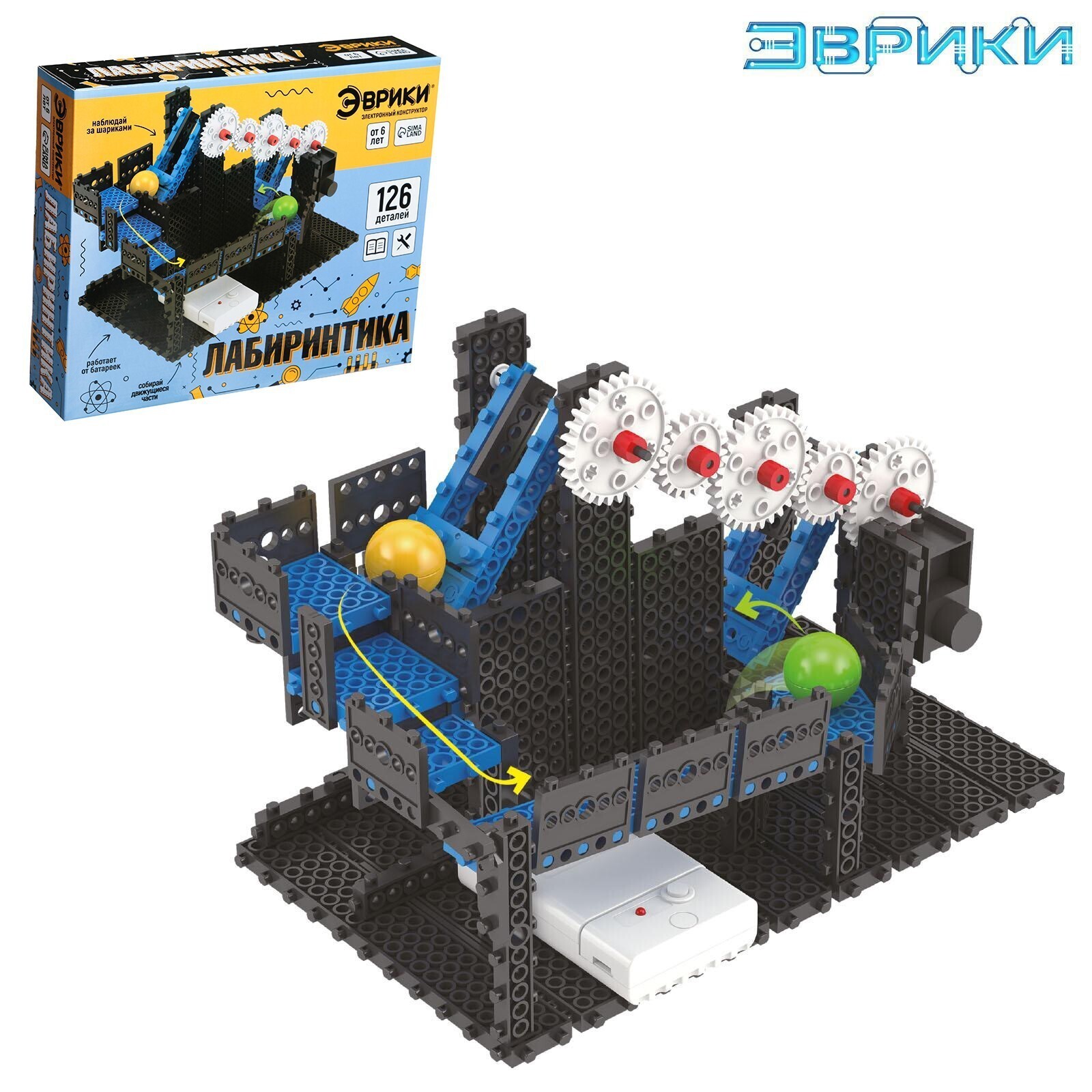 Постройте большой лабиринт с шестерёнками и электромеханическим двигателем! Для этого в наборе есть всё необходимое.