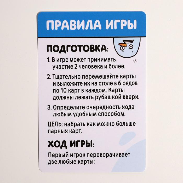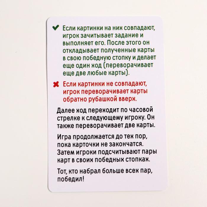 <p><b>Играем и развиваем память</b></p><p>Как не только весело и интересно встретить Новый год, но и развить внимание и память? Очень просто: сыграть в эту игру! Переворачивайте карточки, собирайте парные картинки и выполняйте забавные фанты. Чем больше парных карт, тем ближе вы к победе!</p><p><b>Как играть?</b></p><p>Для начала разложите карточки рядами рубашкой вверх. Далее участники по очереди переворачивают две любые карты.</p><ul><li>Если картинки на них совпадают, игрок зачитывает задание и выполняет его. Затем он откладывает полученные карточки в свою победную стопку и делает ещё один ход (то есть переворачивает ещё две карты).</li><li>Если картинки не совпадают, игрок переворачивает карты снова рубашкой вверх.</li></ul><p>Далее ходит следующий игрок по часовой стрелке. Он также переворачивает две любые карты. Игра продолжается до тех пор, пока карточки не закончатся. Затем игроки подсчитывают пары карт в своих победных стопках. Тот, кто набрал больше всех пар, победил!</p><p><b>Внутри вы найдёте:</b></p><ul><li>60 карт,</li><li>правила игры.</li></ul><p><b>Встречайте Новый год вместе с ЛАС ИГРАС!</b></p>