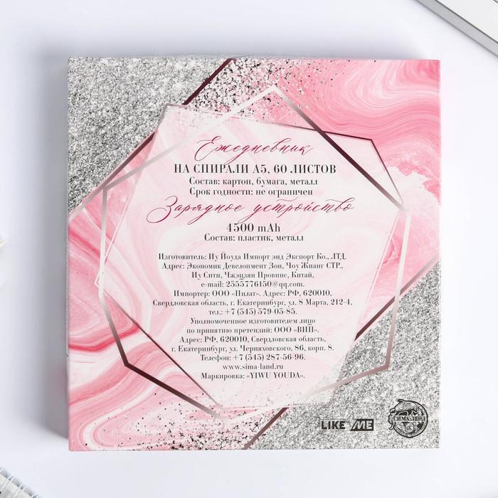 В набор входит ежедневник на спирали формата А5 (60 листов) и зарядное устройство 4500 mAh (размер 14,5 х 2,5 х 5 см).