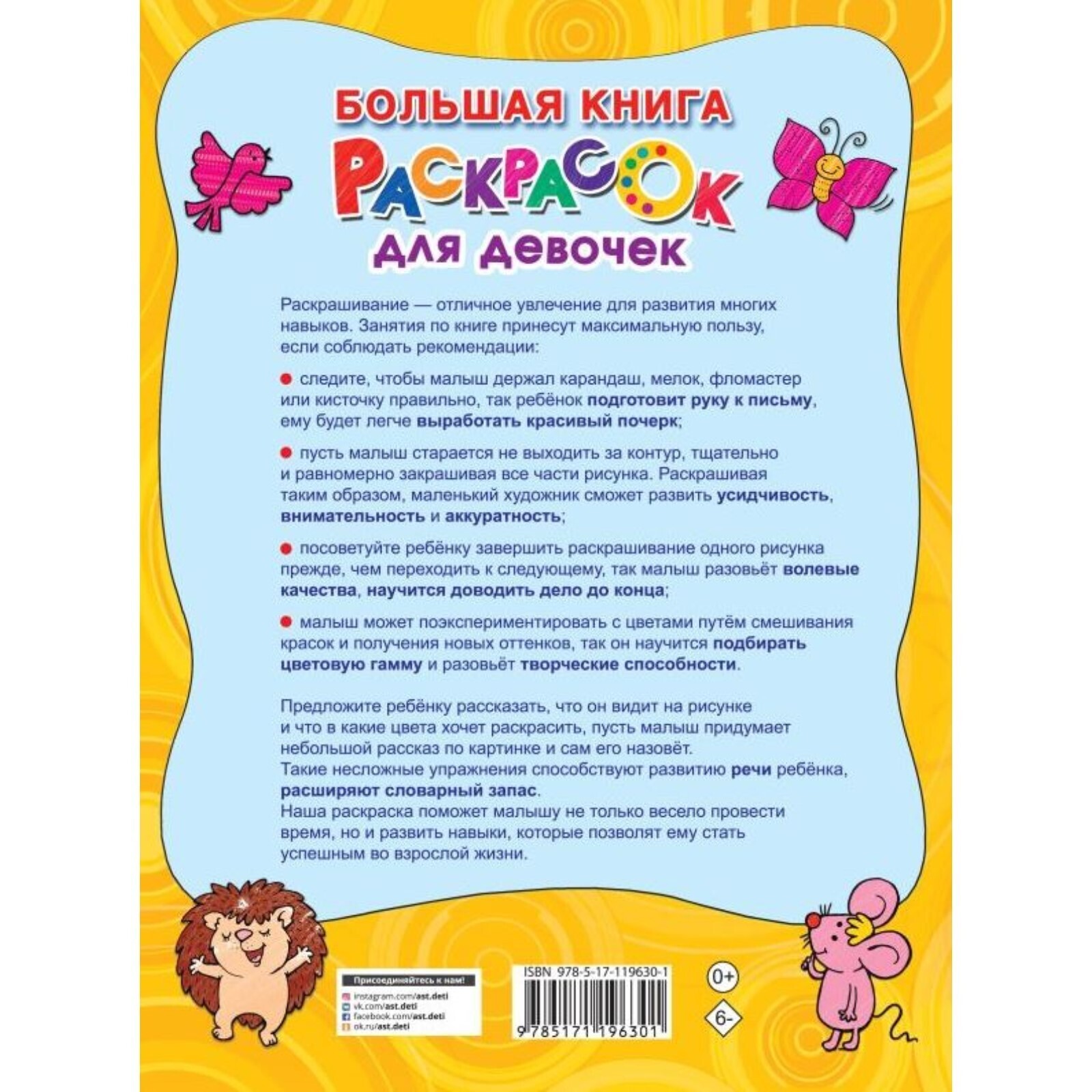 «Большая книга раскрасок для девочек» - это целая коллекция чудесных иллюстраций. Раскрашивая и читая короткие тексты, ребёнок сможет развить художественный вкус, внимание, мелкую моторику, научиться аккуратности, а также расширить словарный запас.