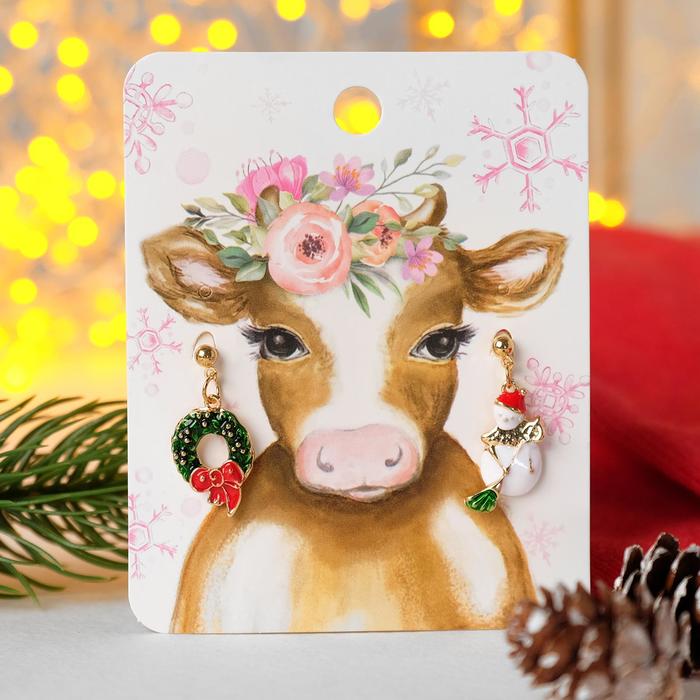 Серьги "Новогодние" снеговик и венок, цветные в золоте 4964976
