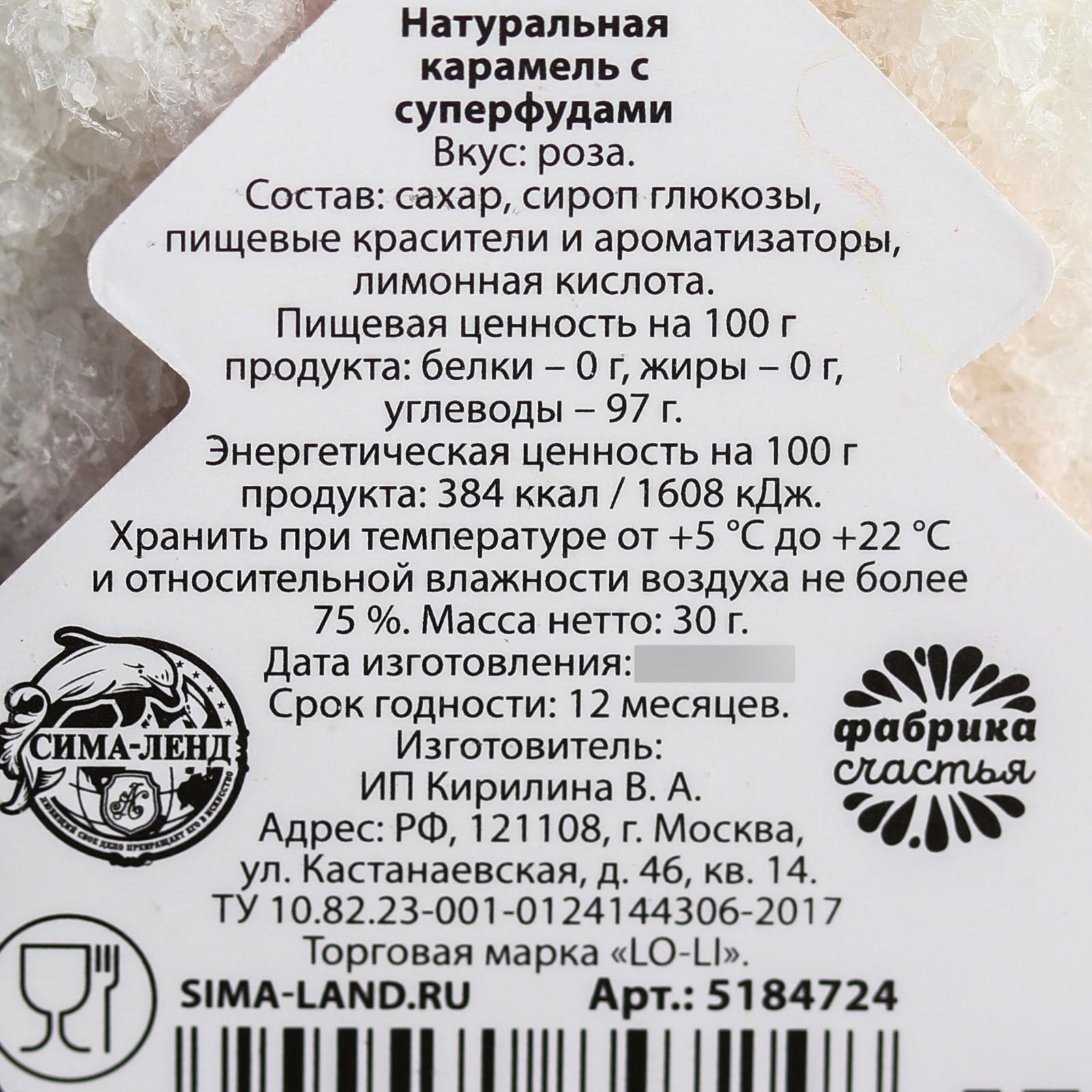 Состав:сахар,сироп глюкозы,пищевый крсители и ароматизаторы "Роза",лимонная кислота. Масса нетто: 30 г. Хранить при температуре от +5 °С до +22 °С и относительной влажности не выше 75 %. Срок годности: 12 месяцев.
