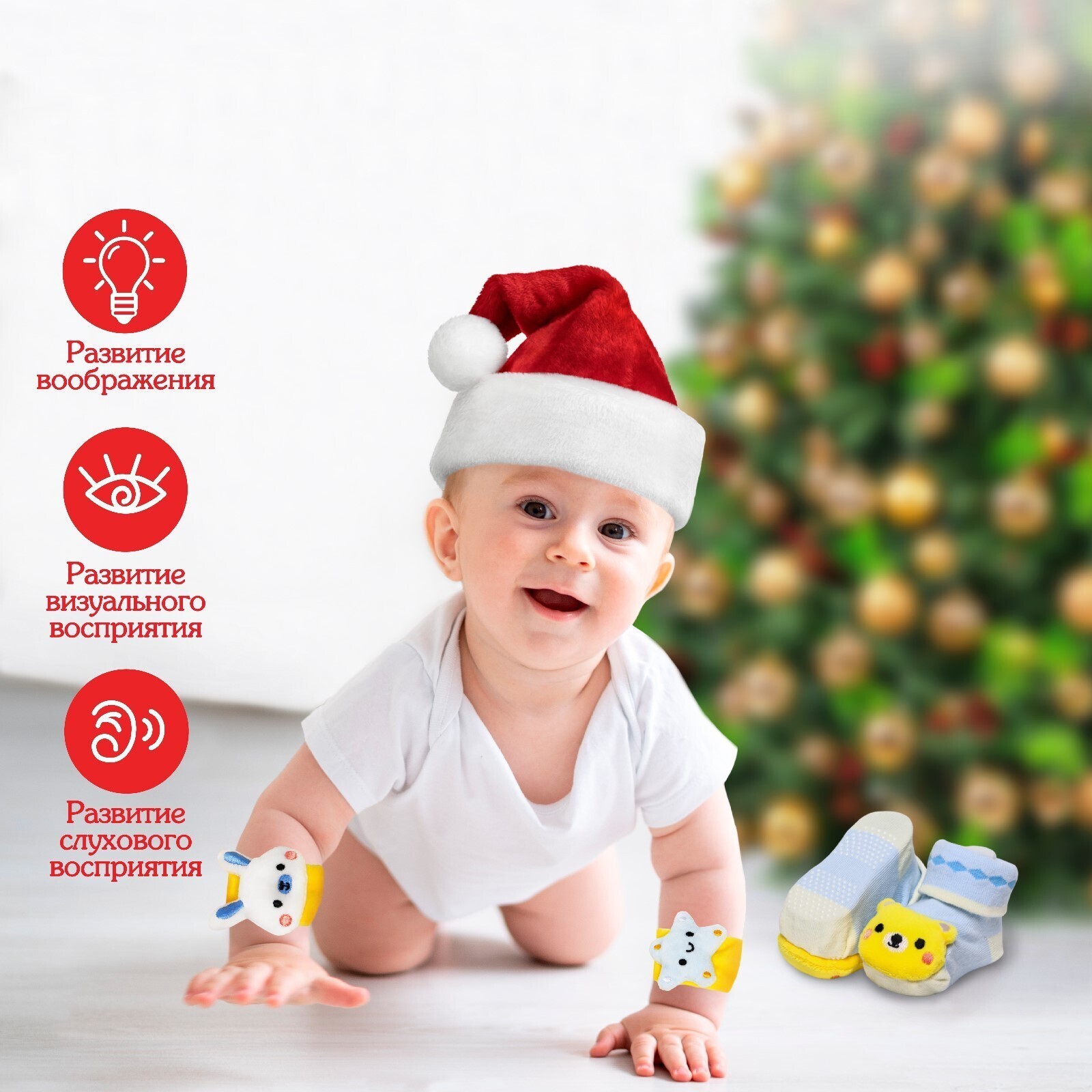 Носочки погремушки и браслетики со звуковым эффектом не только согреют ножки и ручки вашего малыша, но и привлекут его внимание яркими цветами, а также звоном погремушек.