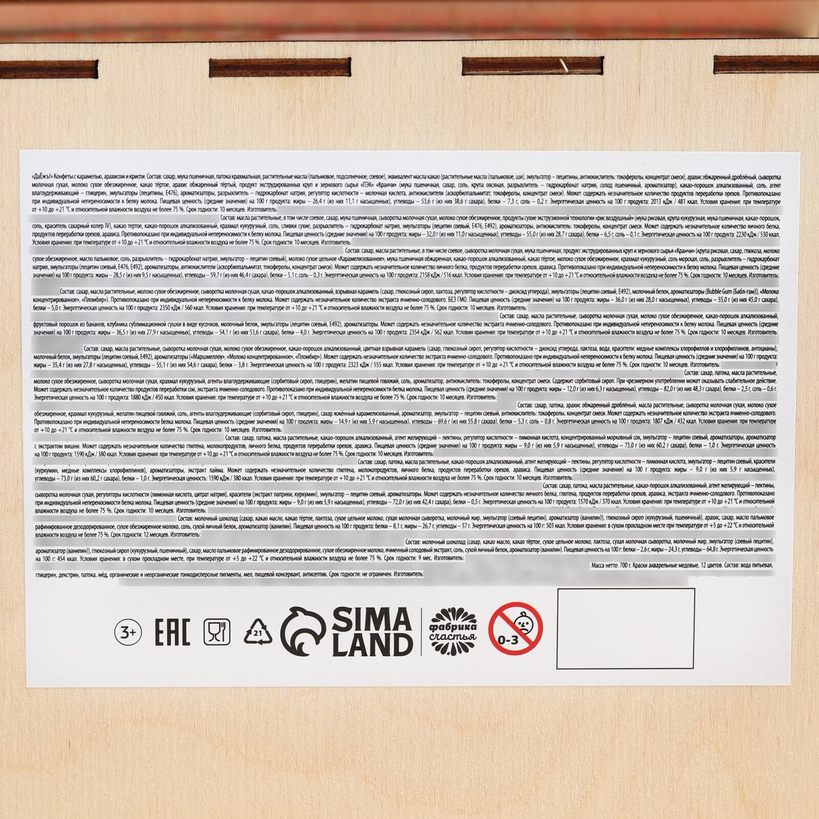 Состав: сахар, патока, масла растительные, какао-порошок алкализованный, агент желирующий – пектины, сыворотка молочная сухая, регуляторы кислотности (лимонная кислота, цитрат натрия), красители (экстракт паприки, куркумин), эмульгатор – лецитин соевый, ароматизаторы. Может содержать незначительное количество яичного белка, глютена, продуктов переработки орехов, арахиса, экстракта ячменно-солодового. Противопоказано при индивидуальной непереносимости белка молока.