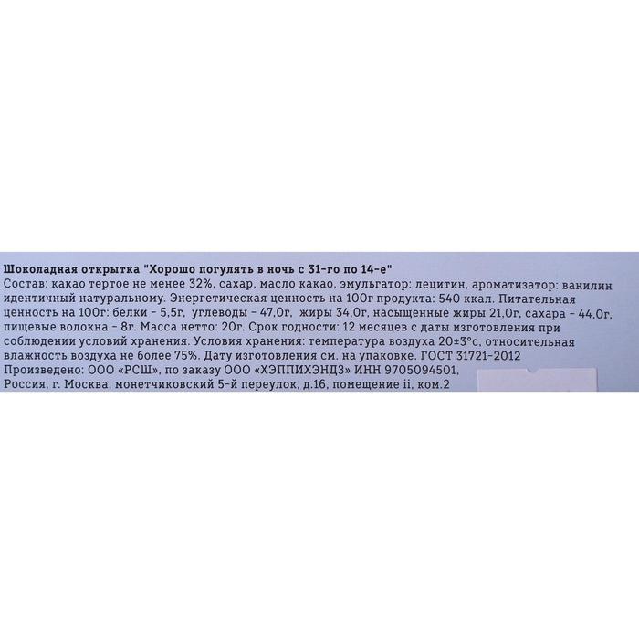 Шоколадная открытка "Хорошо погулять в ночь с 31-го по 14-е" 20 г 5298022