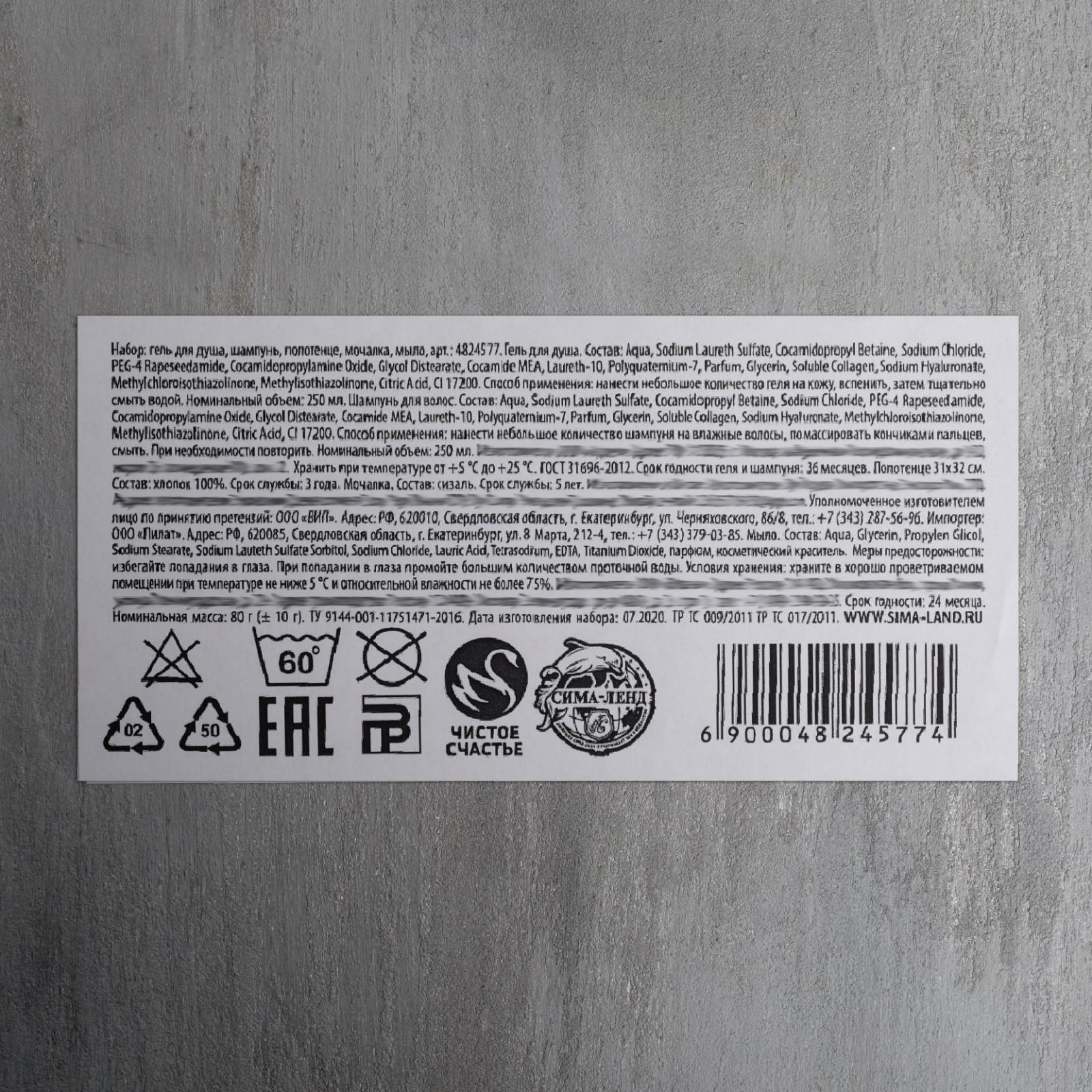 • Составляющие набора Гель для душа, Мочалка, Мыло, Полотенце, Шампунь