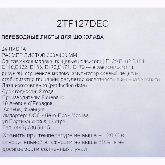 <p>Представляют собой пластиковую пленку с нанесённым на нее рисунком, выполненым какао-маслом, которое было подкрашено пищевыми красителями. Служат для нанесения красочных рисунков на поверхность шоколада или шоколадной глазури.</p>