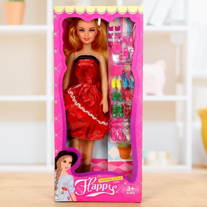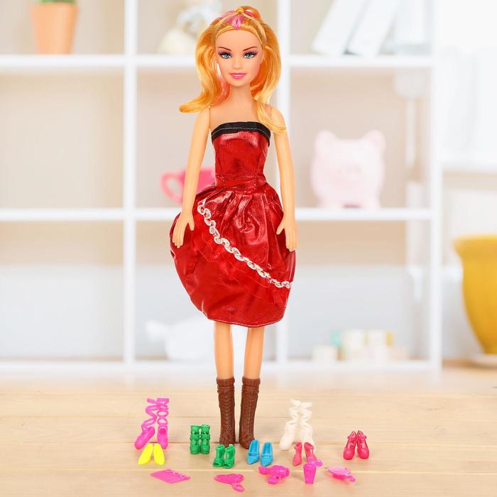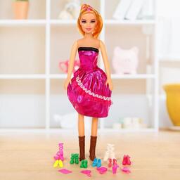 В наборе 8 дополнительных пар обуви и аксессуары для красоты: расчёски, зеркало, фен, духи.