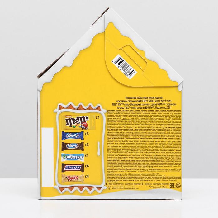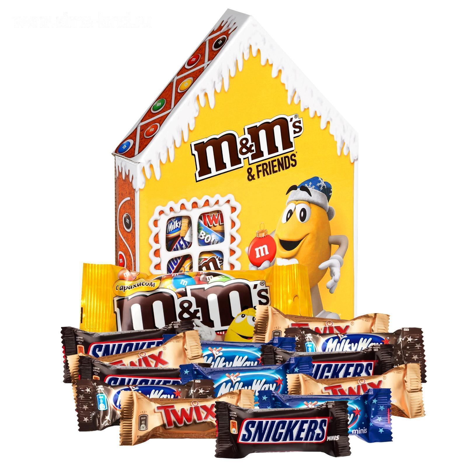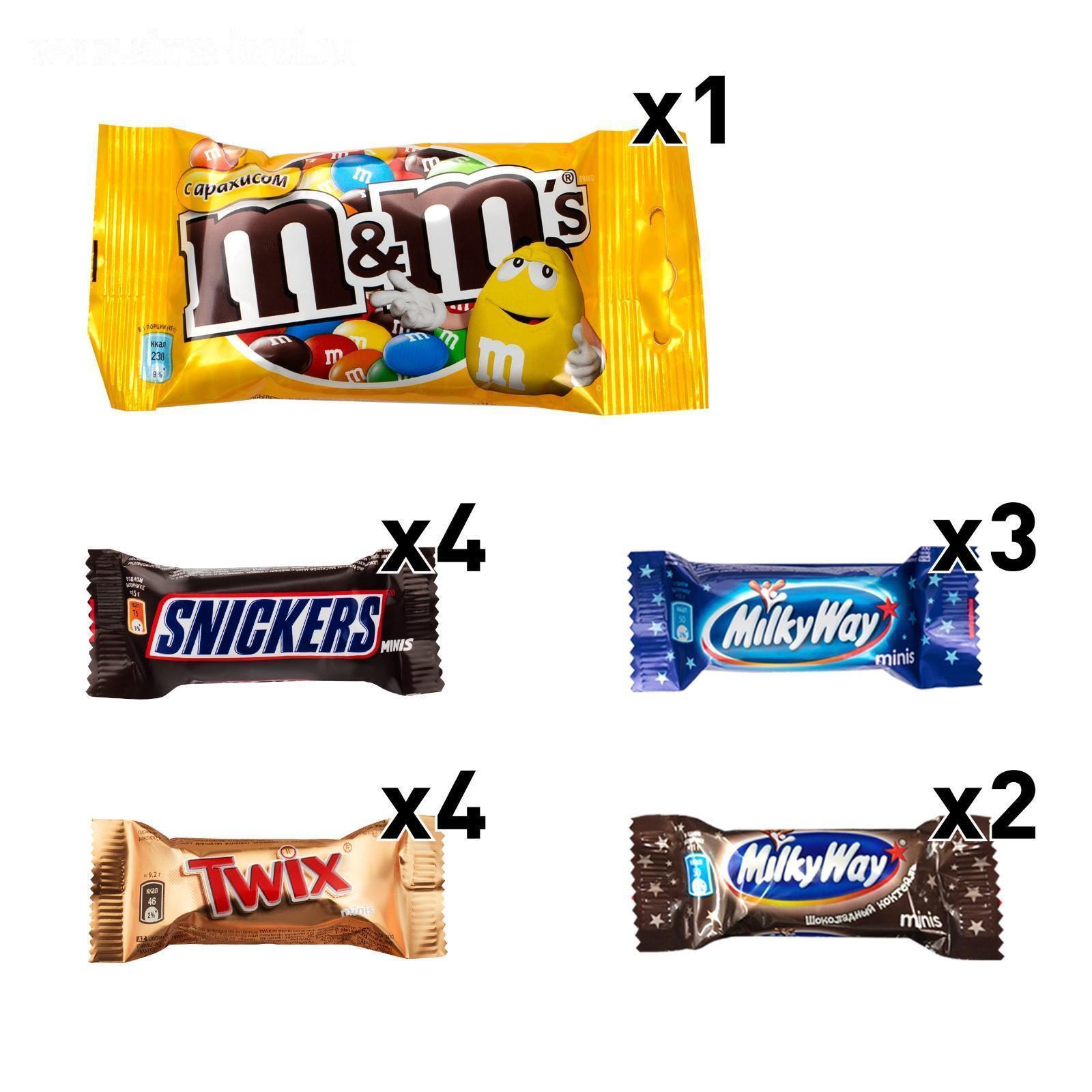 <p>В подарке собраны самые популярные шоколадные батончики в мини вариантах и пакетик драже М&М's с арахисом и молочным шоколадом.</p><p><b>Ассорти микс известных любимых шоколадных батончиков:</b></p><ul><li>Шоколадный батончик SNICKERS®MINIS с жареным арахисом, карамелью и нугой, покрытый молочным шоколадом, 4 шт.</li><li>Шоколадный батончик MILKY WAY® minis с суфле, покрытый молочным шоколадом, 3 шт.</li><li>Шоколадный батончик MILKY WAY® minis “Шоколадный коктейль” с какао-суфле, покрытый молочным шоколадом, 3 шт.</li><li>Драже M&M's® c арахисом и молочным шоколадом, покрытое хрустящей разноцветной глазурью. Масса нетто: 1 х 45 г.</li><li>Печенье сахарное TWIX®minis с карамелью, покрытое молочным шоколадом, 4 шт.</li></ul><p><b>Хранить при температуре от +5 °С до +22 °С и относительной влажности воздуха не более 70 %.</b></p>