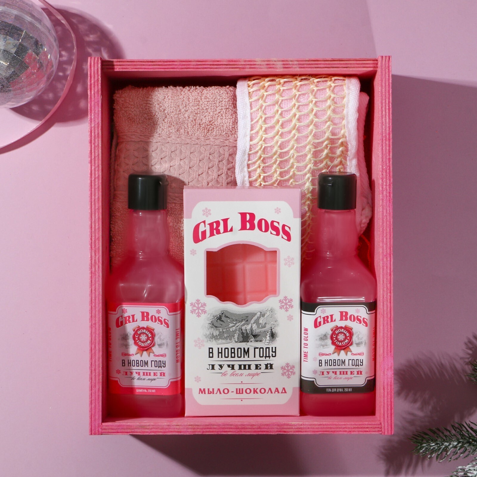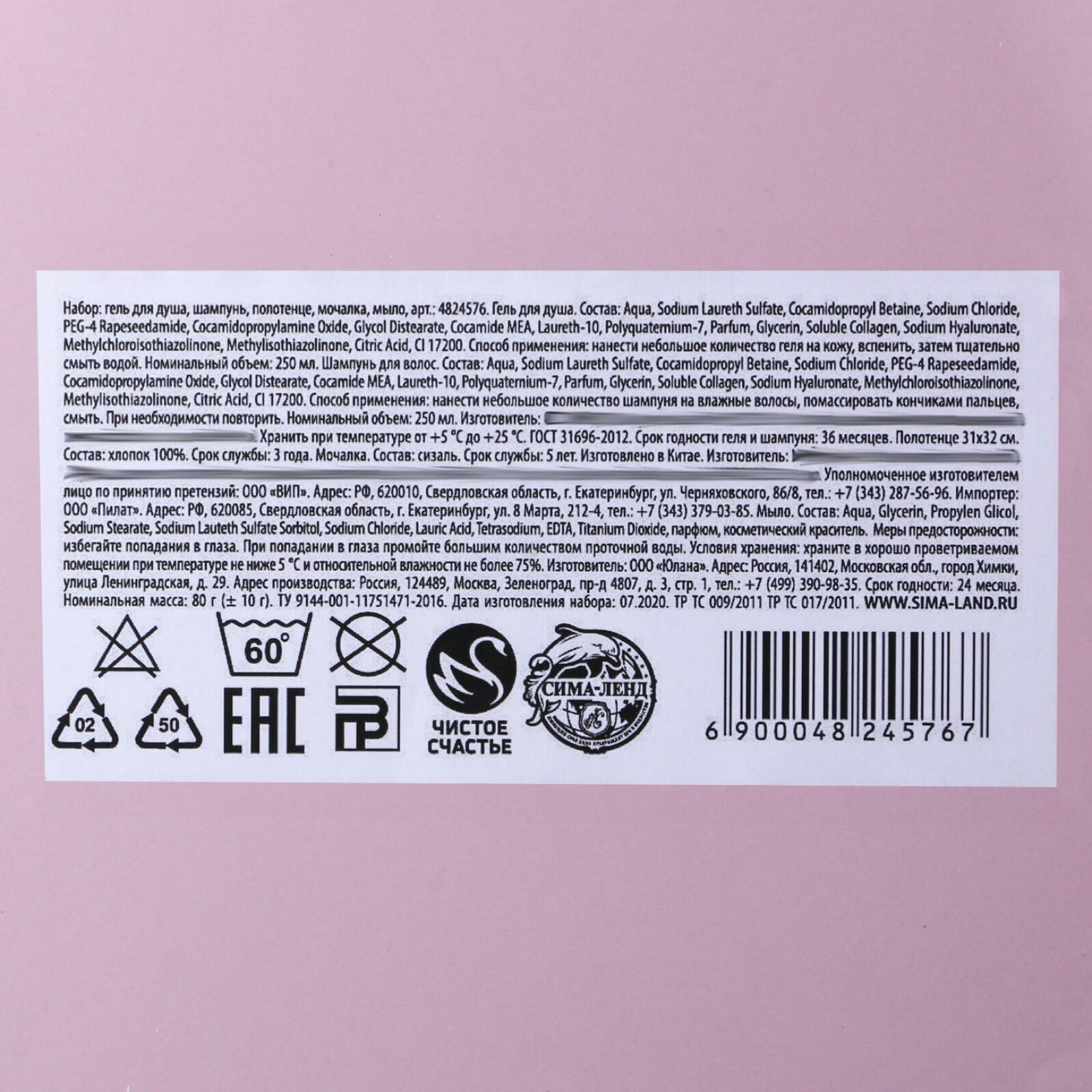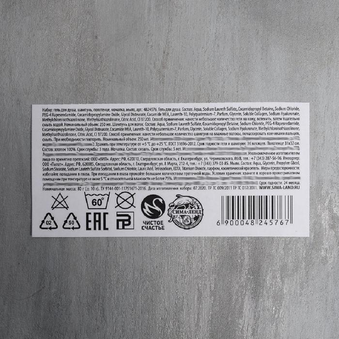 • Составляющие набора Гель для душа, Мочалка, Мыло, Полотенце, Шампунь