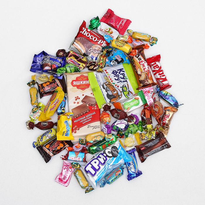 <p><b>В подарке 47изделий:</b></p><p><b>Mars:</b> Twix - 1 шт; Milky Way - 1 шт. </p><p><b>Nestle:</b> KITKAT MINI - 1 шт; Nesquik - 1 шт. </p><p><b>Orion:</b> Choco Pie - 1 шт. </p><p><b>Люси:</b> Мармелад Новогодний - 1 шт. </p><p><b>Красный Октябрь:</b> Степашка - 1 шт; Бури вестник - 1 шт; Ласточка - вестница весны - 1 шт; Батончики Полюшко - 1 шт; Ирис Сказка Золотой ключик - 2 шт; Забава, вишня - 2 шт; Забава, лимон - 2 шт; Батончики ореховая роща - 1 шт. </p><p><b>КДВ, Яшкино:</b> Jet`s - 1 шт; Fruit Story - 1 шт; Бонфетти - 1 шт; Мексикана - 1 шт; Карамель на палочке Strike, ассорти - 1 шт; Солярики - 2 шт; Глэйс - 2 шт; Кремка клубника и сливки - 2 шт. </p><p><b>Sweet life:</b> Лёвчик - 1 шт; Тетёха - 1 шт. </p><p><b>Славянка:</b> Медунок - 1 шт; Жаклин - 1 шт; Движок - 1 шт; Фрутландия - 1 шт; Шоколад Сладко 92 г - 1 шт; Печенье Spark - 1 шт; Чехарда - 2 шт. </p><p><b>Акконд:</b> Лапки -царапки - 1 шт. </p><p><b>Невский кондитер:</b> Рёва/вафельные в глазури - 1 шт. </p><p><b>Самарский кондитер:</b> Волшебная нежность - 1 шт. </p><p><b>Конти:</b> СЛАДКОЕ СОЗВУЧИЕ - 1 шт; Живинка - 1 шт. </p><p><b>Essen:</b> ДаЕжъ! - 1 шт. </p><p><b>Сириус:</b> Пирамидка - 1 шт. </p><p><b>Slasti:</b> Капля лета - 2 шт. </p>