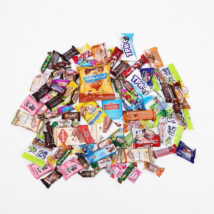 <p><b>В подарке 92 шт изделия:</b></p><p><b>Nestle:</b> KITKAT MINI - 2 шт; Nesquik шоколад 100 г - 1 шт. </p><p><b>Mars:</b> Snickers - 2 шт. </p><p><b>Orion:</b> Choco Pie - 1 шт. </p><p><b>Славянка:</b> Romantica- 3 шт; Движок - 3 шт; Фрутландия - 3 шт; Детский сувенир в стране Лилипутов- 2 шт; Печенье ; Степ- 2 шт; Степ лесной орех- 2 шт; Шоколад Сладко 92 г - 1 шт; Детский сувенир - 1 шт; Spark- 2 шт; Медунок - 3 шт; Жаклин - 2 шт; Фрутландия - 3 шт. </p><p><b>Slasti:</b> Капля лета - 4 шт.</p><p><b>КДВ, Яшкино:</b> Солярики - 4 шт; Кремка клубника и сливки - 4 шт; Чехарда - 3 шт; Fruit Story - 4 шт;</p><p><b>Невский кондитер:</b> ; Рёва/вафельные в глазури - 3 шт; Глэйс - 3 шт; Jet`s - 3 шт; Джаззи - 3 шт; Гематоген - 2 шт; BabyFox батончик с молочной начинкой, 47 г - 1 шт; Бомбастер, попкорн - 1 шт; Мармелад BabyFox с соком ягод и фруктов, 70 г - 1 шт. </p><p><b>Красный Октябрь:</b> Ирис Сказка Золотой ключик - 3 шт; Батончики ореховая роща - 3 шт; Лакомка - 2 шт. </p><p><b>Люси:</b> Мармелад Новогодний- 2 шт. </p><p><b>Невский кондитер:</b> Картошка - 3 шт; Атташе - 3 шт. </p><p><b>Сириус:</b> Пирамидка - 2 шт. </p><p><b>Essen:</b> ДаЕжъ! - 2 шт; Батончик 35 - 2 шт. </p><p><b>Sofio:</b> Маршмеллоу 80 гр - 1 шт. </p>