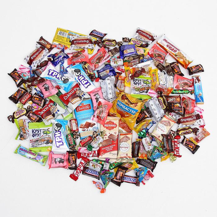 <p><b>В подарке 144 изделия:</b></p><p><b>Nestle:</b> KITKAT MINI - 3 шт; Nesquik шоколад 100 г - 1 шт. </p><p><b>Mars:</b>Snickers - 3 шт. </p><p><b>Orion:</b>Choco Pie - 2 шт. </p><p><b>Slasti:</b> Капля лета - 5 шт.</p><p><b>КДВ, Яшкино:</b> Солярики - 6 шт; Кремка клубника и сливки - 6 шт; Fruit Story - 6 шт; Глэйс - 6 шт; Jet`s - 6 шт; Romantica- 6 шт; Джаззи - 6 шт; Гематоген - 2 шт; BabyFox батончик с молочной начинкой, 47 г - 1 шт; Бомбастер, попкорн - 1 шт; Мармелад BabyFox с соком ягод и фруктов, 70 г - 1 шт. </p><p><b>Славянка:</b> Чехарда - 6 шт; Фрутландия - 6 шт; Степ- 4 шт; Степ лесной орех- 2 шт; Шоколад Сладко 92 г - 1 шт; Фрутландия - 6 шт; Детский сувенир в стране Лилипутов- 4 шт; Печенье Spark- 3 шт;Медунок - 4 шт; Жаклин - 3 шт; Детский сувенир - 1 шт. </p><p><b>Люси:</b> Мармелад Новогодний- 3 шт. </p><p><b>Красный Октябрь:</b> Ирис Сказка Золотой ключик - 6 шт; Лакомка - 2 шт;Батончики ореховая роща - 4 шт.</p><p><b>Сириус:</b> Пирамидка - 3 шт. </p><p><b>Essen:</b> ДаЕжъ!- 3 шт; Батончик 3 шт5- 2 шт. </p><p><b>Sofio:</b> Маршмеллоу 80 гр - 1 шт. </p><p><b>Невский кондитер:</b> Рёва/вафельные в глазури - 6 шт; Атташе- 3 шт; Картошка - 4 шт.</p>