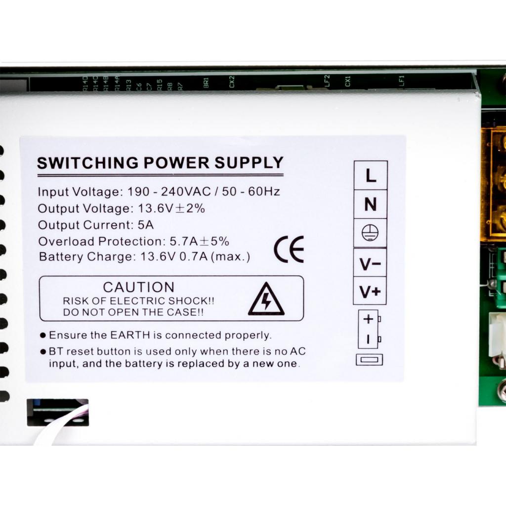 Джерело безперебійного живлення GreenVision GV-002-UPS-A-1201-5A (5457) захищений від коротких замикань і від перевантажень по струму. Він виконаний в металевому корпусі з дверцятами. Корпус пофарбований у білий колір і має три світлоіндикатор для індикації режимів роботи. Є вільне місце для установки і підключення АКБ ємністю до 7Ah. Цей пристрій має такі технічні характеристики: вхідна напруга 100-240 вольт змінного струму, вихідна напруга 12 вольт, загальний вихідний струм 5 ампер, частота мережі 50-60 Гц.