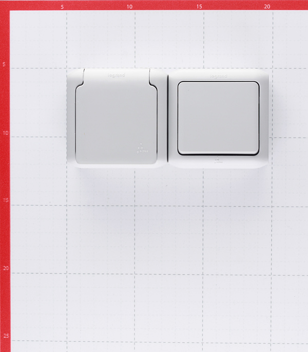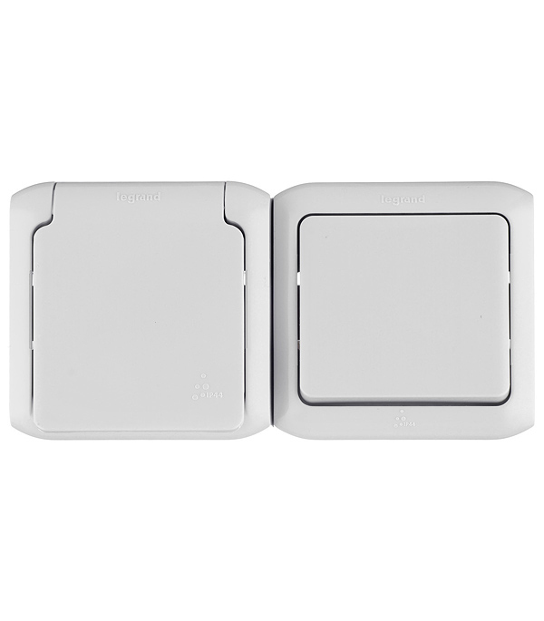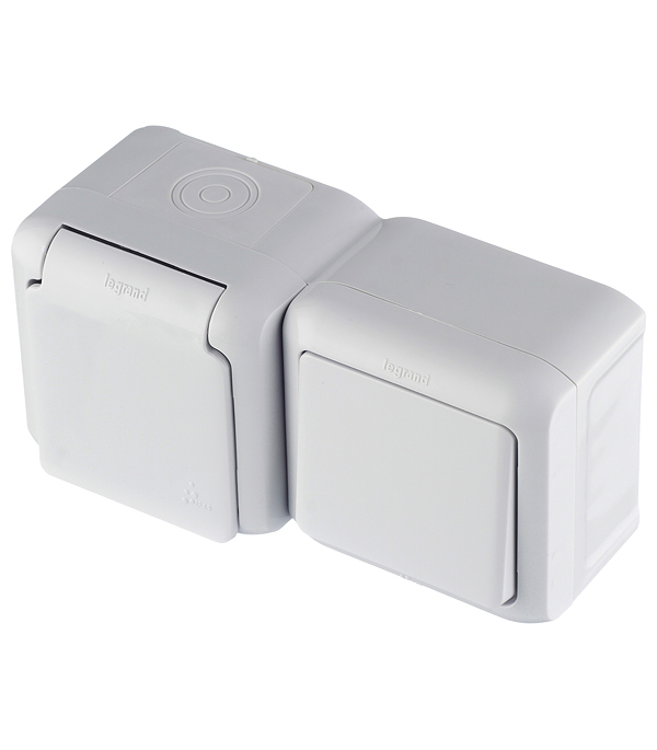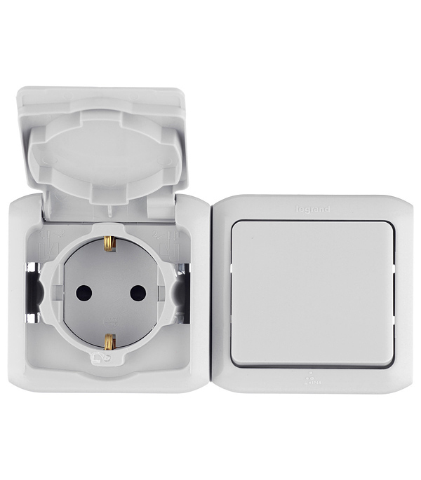 Блок выключатель с розеткой Legrand Quteo 782348 одноклавишный открытая установка серый с зазем