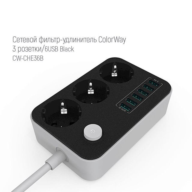 Сетевой фильтр COLORWAY 3 розетки/6 USB black (CW-CHЕ36B)